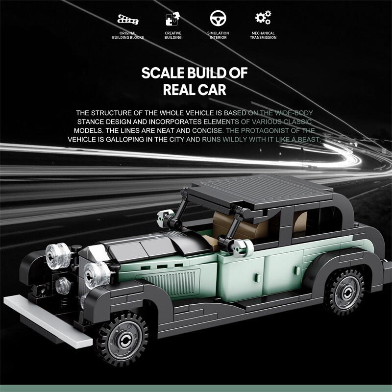 Model Bentley 8 Litre od značky Reobrix věrně zachycuje ducha 30. let – období, kdy byl tento automobil symbolem výkonu, pohodlí a prestiže. Stavebnice v zeleném provedení s chromovými detaily přináší jedinečný zážitek ze stavby klasického veteránu s realistickými proporcemi.