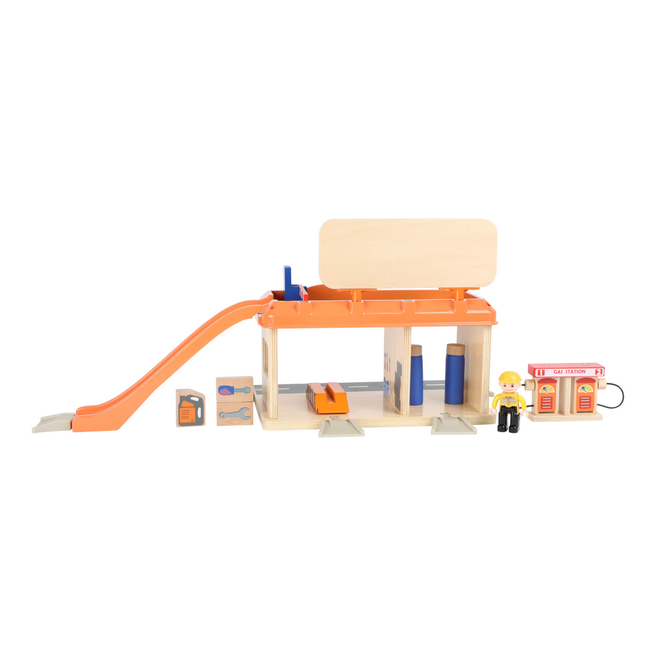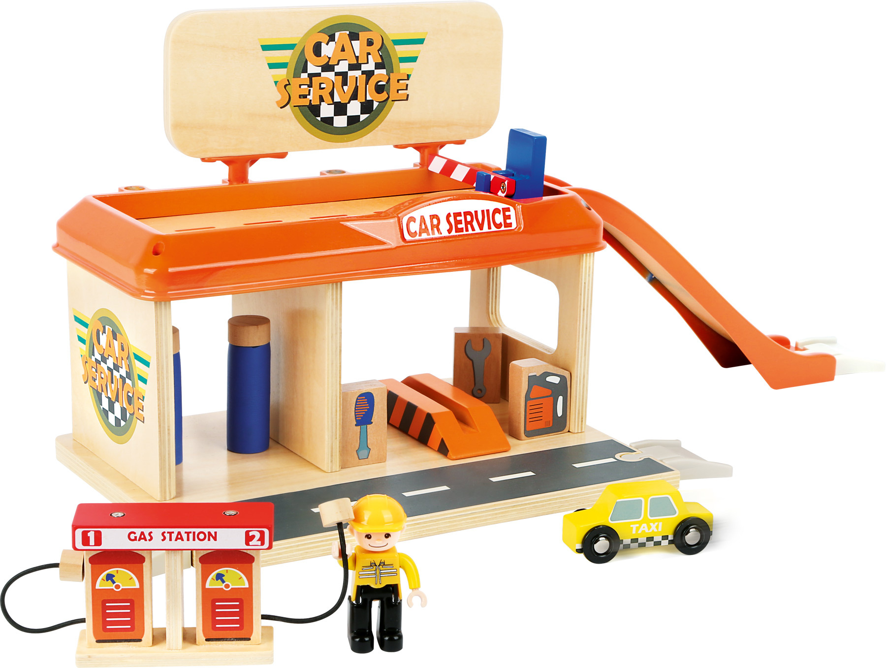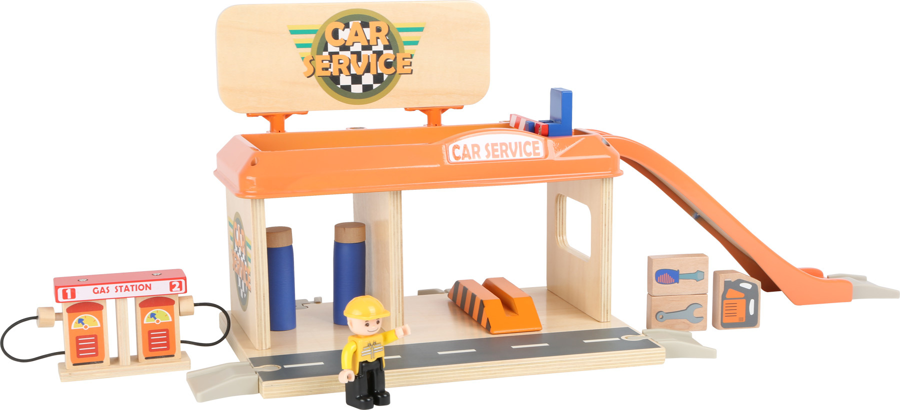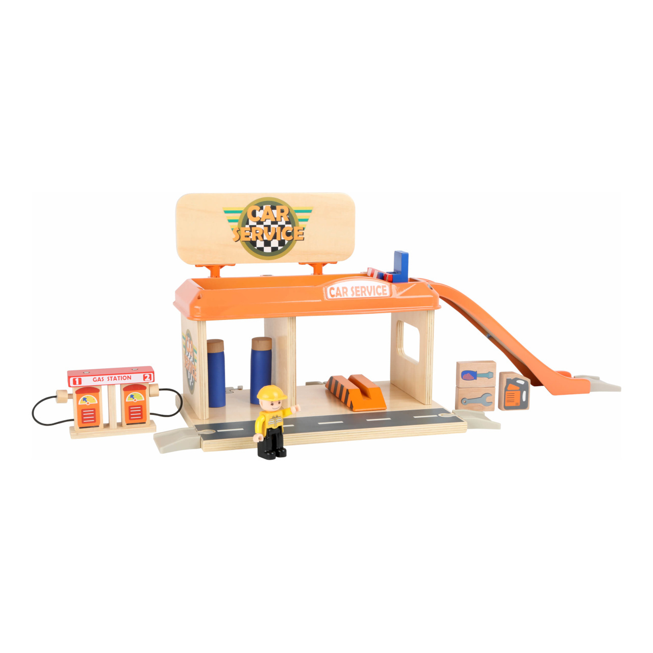 Služby na nejvyšší úrovni! Při pohledu na vybavení autoservisu zaplesá srdíčko každého malého fanouška motorů, jeho součástí je totiž krom autodílny vybavené plošinou a nezbytným příslušenstvím také čerpací stanice s magnetickými pistolemi, nebo myčka. Díky nájezdové rampě mohou zákazníci využít služeb parkoviště na střeše servisu, opatřeného bezpečnostní závorou. Co víc, k plné spokojenosti je zde k dispozici i pohyblivá figurka profesionální obsluhy a vždy připravené vozidlo taxislužby! Díky kombinaci silné překližky a robustních plastových dílů může hračka nabídnout vysokou odolnost a životnost. Lze ji rozšířit množstvím příslušenství a je také plně kompatibilní s vláčkodráhami jiných velkých výrobců.
