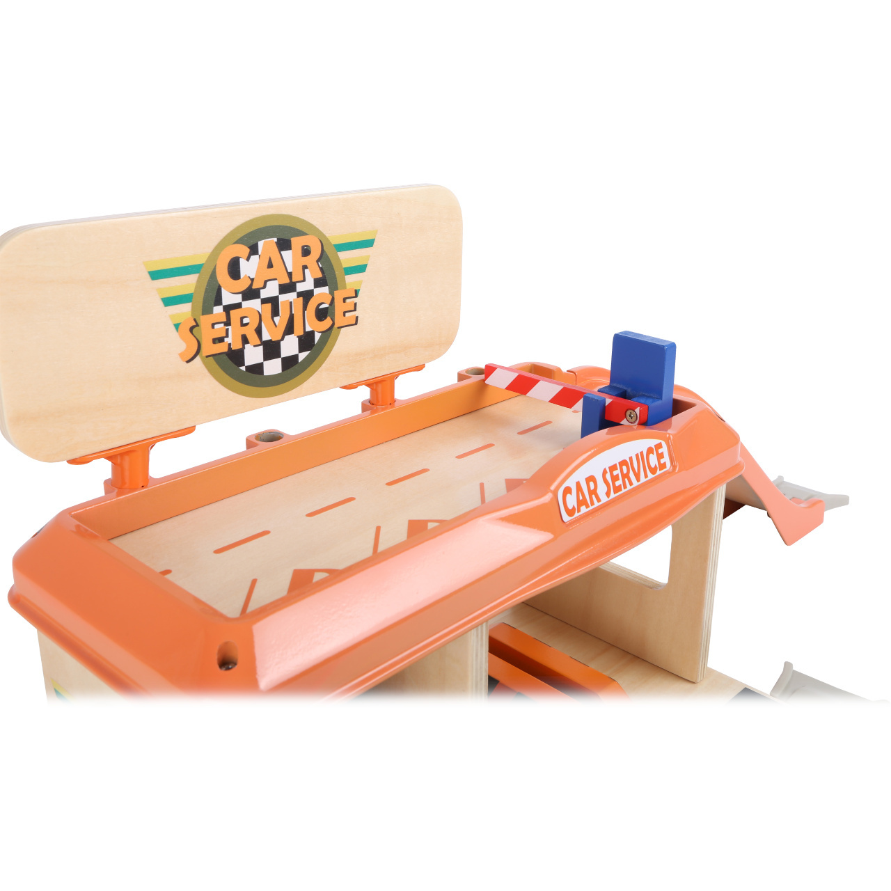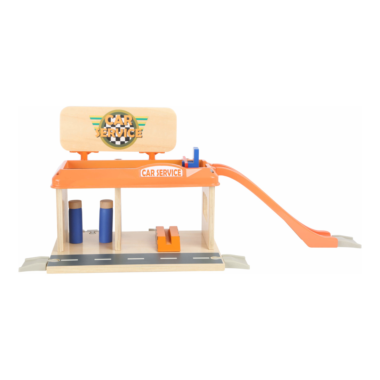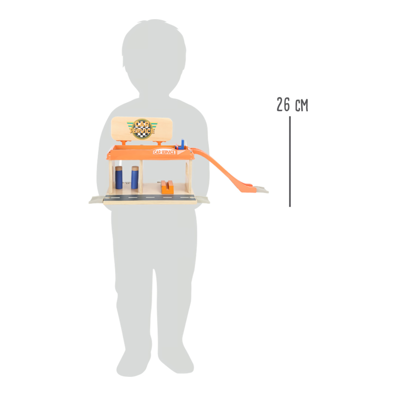 Služby na nejvyšší úrovni! Při pohledu na vybavení autoservisu zaplesá srdíčko každého malého fanouška motorů, jeho součástí je totiž krom autodílny vybavené plošinou a nezbytným příslušenstvím také čerpací stanice s magnetickými pistolemi, nebo myčka. Díky nájezdové rampě mohou zákazníci využít služeb parkoviště na střeše servisu, opatřeného bezpečnostní závorou. Co víc, k plné spokojenosti je zde k dispozici i pohyblivá figurka profesionální obsluhy a vždy připravené vozidlo taxislužby! Díky kombinaci silné překližky a robustních plastových dílů může hračka nabídnout vysokou odolnost a životnost. Lze ji rozšířit množstvím příslušenství a je také plně kompatibilní s vláčkodráhami jiných velkých výrobců.