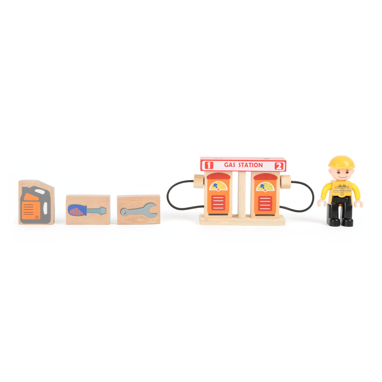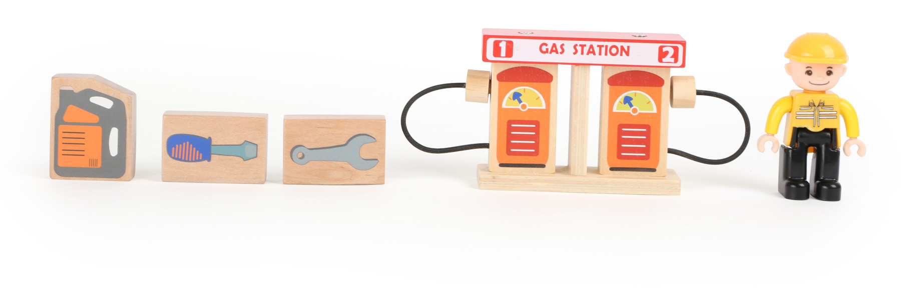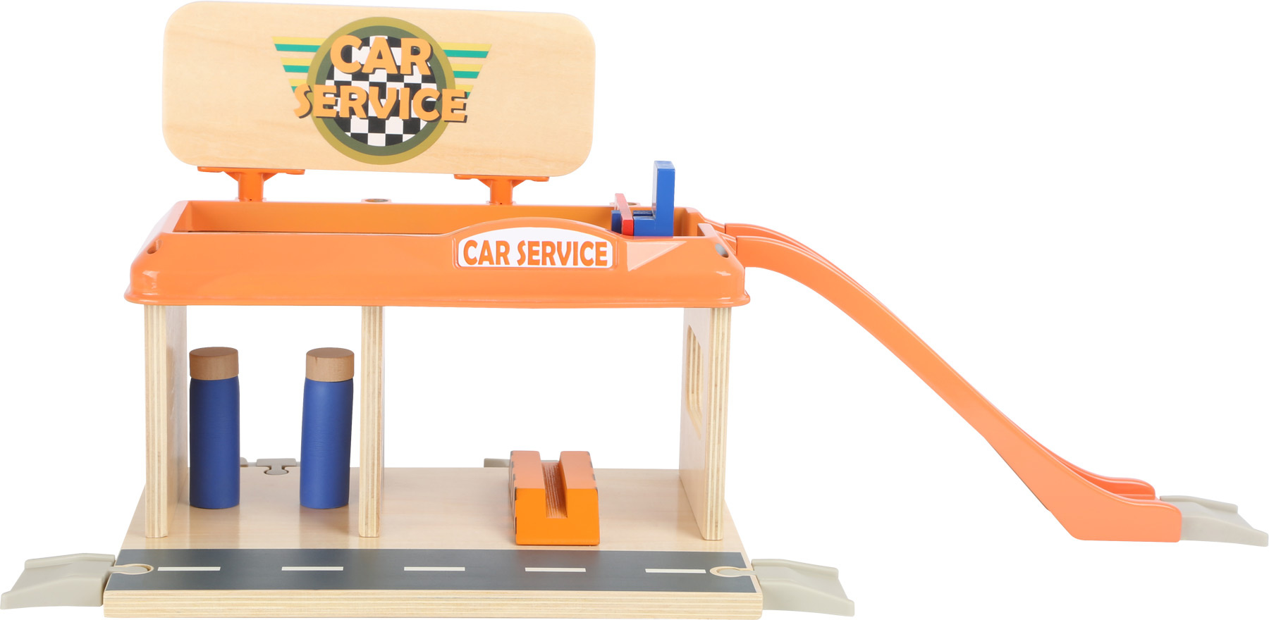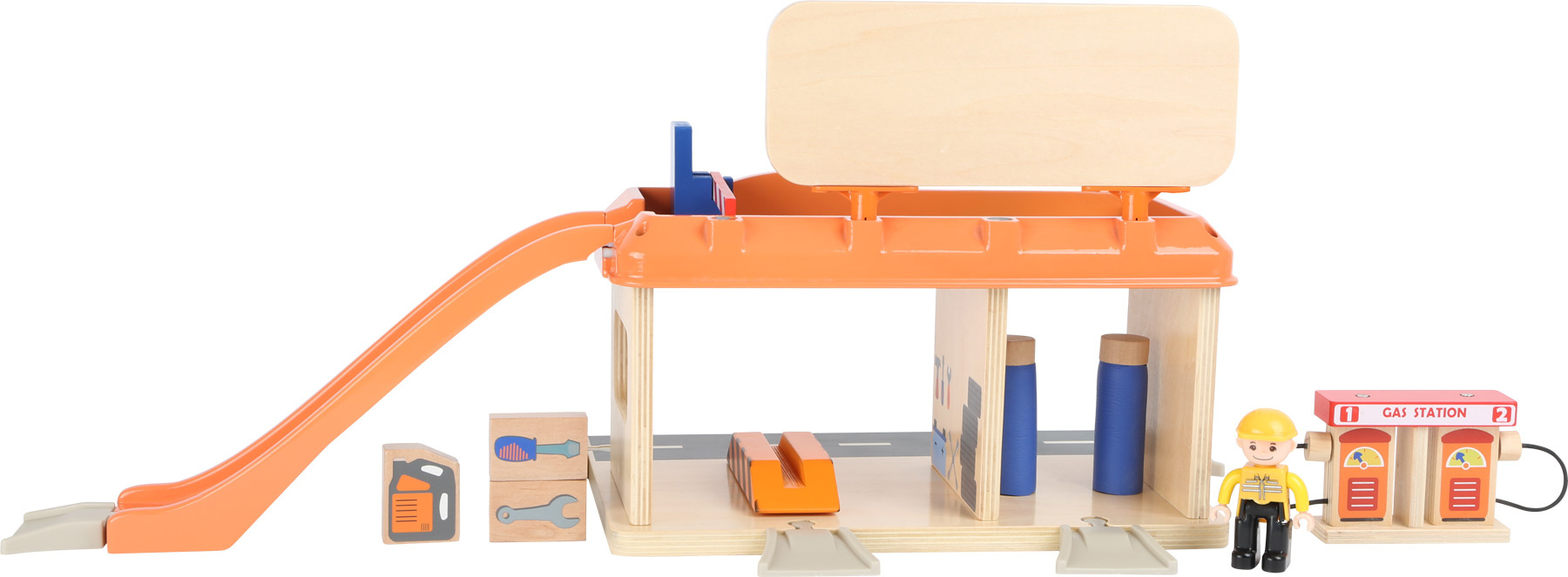Služby na nejvyšší úrovni! Při pohledu na vybavení autoservisu zaplesá srdíčko každého malého fanouška motorů, jeho součástí je totiž krom autodílny vybavené plošinou a nezbytným příslušenstvím také čerpací stanice s magnetickými pistolemi, nebo myčka. Díky nájezdové rampě mohou zákazníci využít služeb parkoviště na střeše servisu, opatřeného bezpečnostní závorou. Co víc, k plné spokojenosti je zde k dispozici i pohyblivá figurka profesionální obsluhy a vždy připravené vozidlo taxislužby! Díky kombinaci silné překližky a robustních plastových dílů může hračka nabídnout vysokou odolnost a životnost. Lze ji rozšířit množstvím příslušenství a je také plně kompatibilní s vláčkodráhami jiných velkých výrobců.