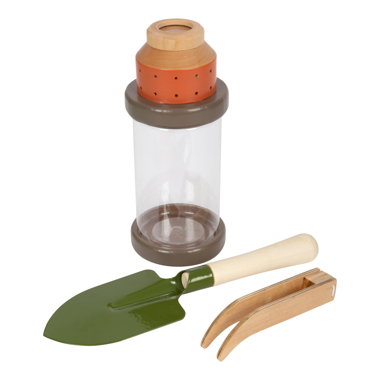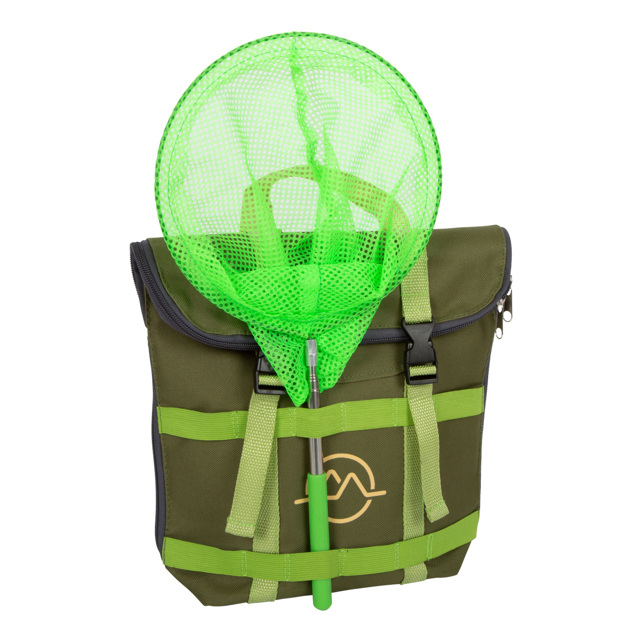 Pro milovníky dobrodružství! Tento odolný batoh se stane ideálním společníkem na cestách přírodou. Vejde se do něj pohodlně všechno vybavení: nádoba na hmyz se šroubovacím víčkem a integrovanou lupou, dřevěný dalekohled, síť na hmyz s teleskopickou tyčkou, kompas na šňůrce, lupa, pinzeta, lopatka, karabina. Na batohu je praktické, že jej lze díky zipu otevřít dokořán, má nastavitelné ramenní popruhy a mnoho poutek, na která můžete zavěsit vybavení.