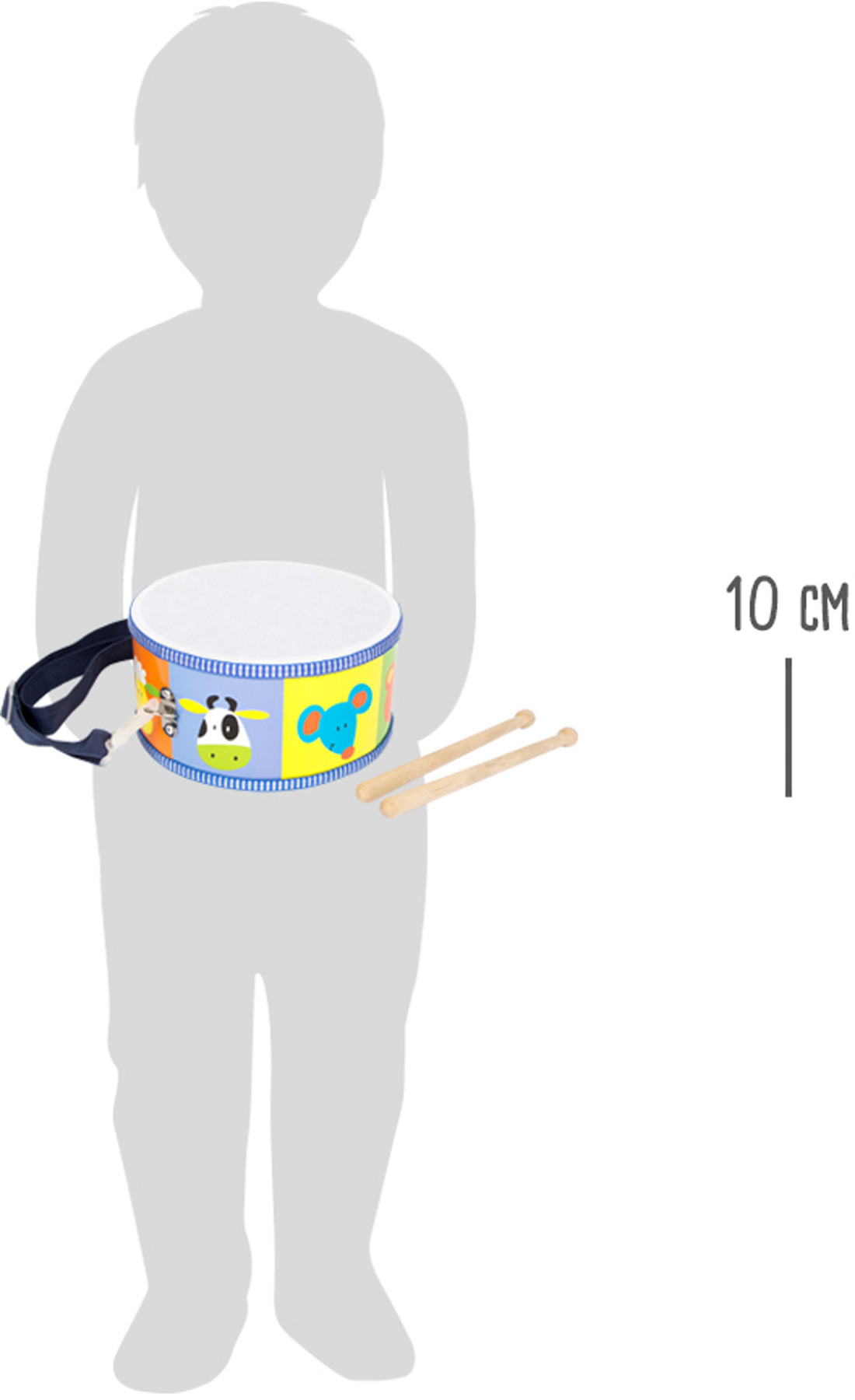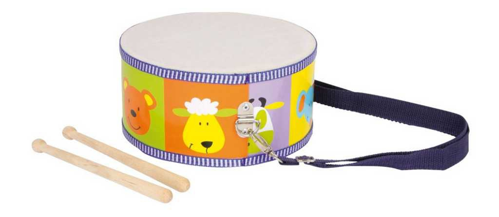 Pohádkově barevný buben s roztomilými zvířecími hlavami zve k veselé vzpouře v dětském pokoji! To není hluk, to je hudba a radost z pohybu na celé čáře! Zde si mohou děti procvičit motoriku, vyřádit se a probudit zájem o hudbu! Včetně nastavitelného popruhu s 2 karabinkami a 2 bubínkovými paličkami (délka: cca 18 cm).