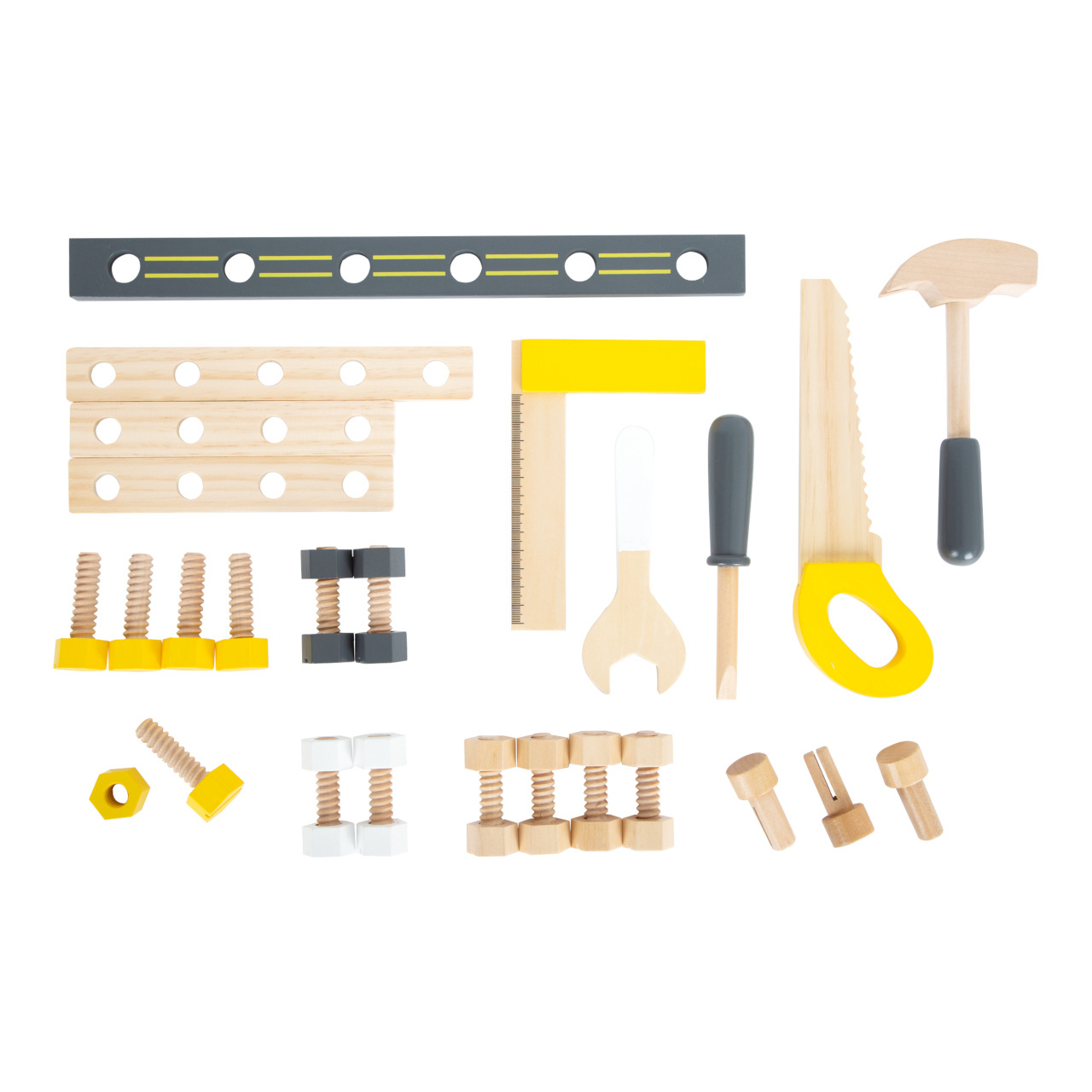 V této dílně se toho děje opravdu hodně. S tímto kompaktním ponkem v klasických barvách, který je viditělně dřevěný si děti mohou otestovat svou zručnost. Děti vám také mohou pomoci se složením tohoto herního ponku! Všechno nářadí a doplňky můžete do ponku uložit tak, aby nezabíraly moc místa. V balení 5 kusů nářadí a mnoho doplňků – 1 svěrák, 3 perforované dřevěné pásky, 1 metr, 1 pilka, 2 šroubováky, 1 kladivo, 5 šroubů, 5 matek, 3 dřevěné hřebíky.