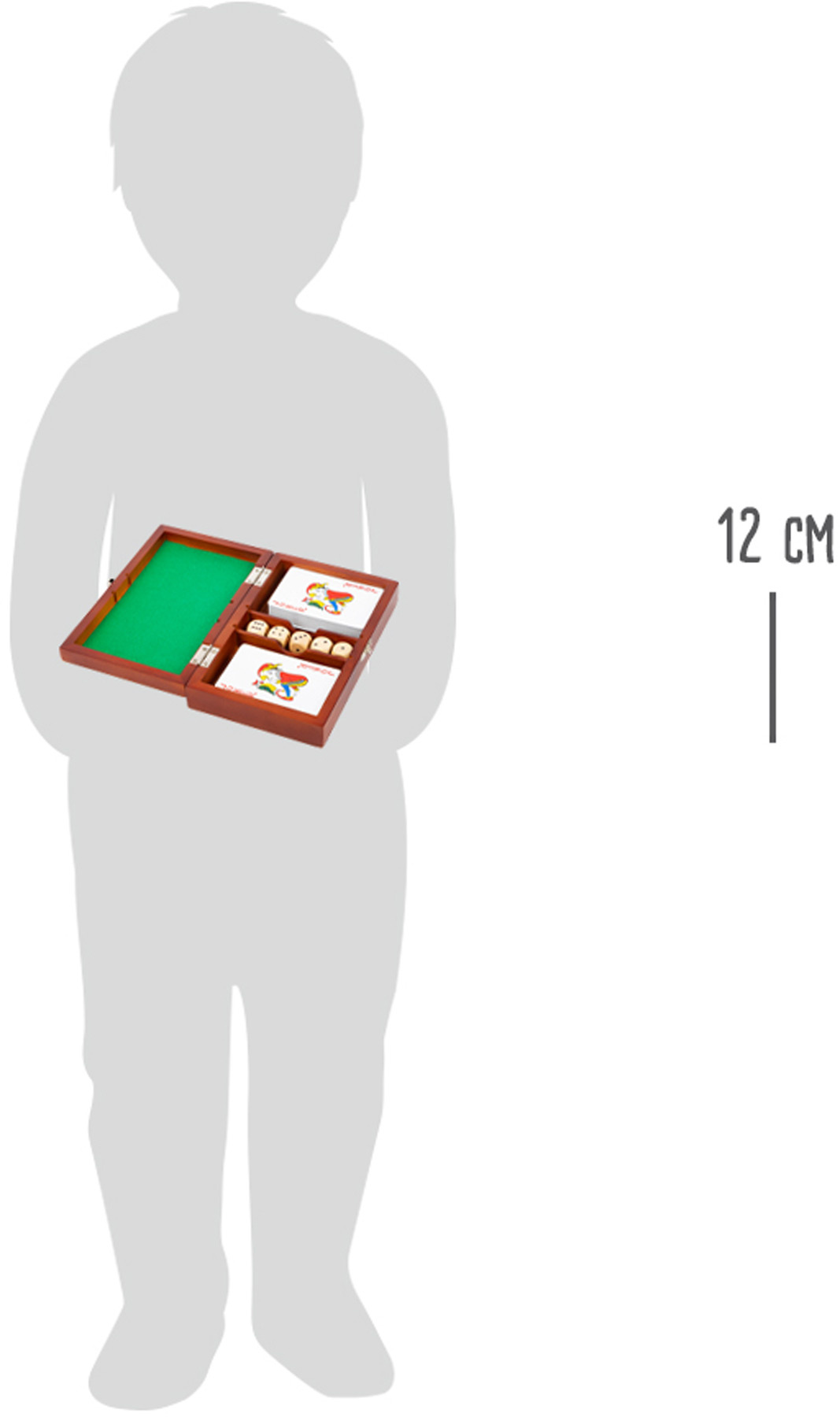 Tento vysoce kvalitní dřevěný box je jako malé kasino! Uvnitř najdete balení karet a 5 kostek. Se dvěma balíčky 54 karet lze hrát klasické hry jako skat, mau mau(varianta prší) a doppelkopf(dvojitá hlava). Část boxu v sobě má zelenou látku, která je ideální pro hody kostkou. Zámkem lze box bezpečně zavřít, hra je tedy ideální i na cesty.