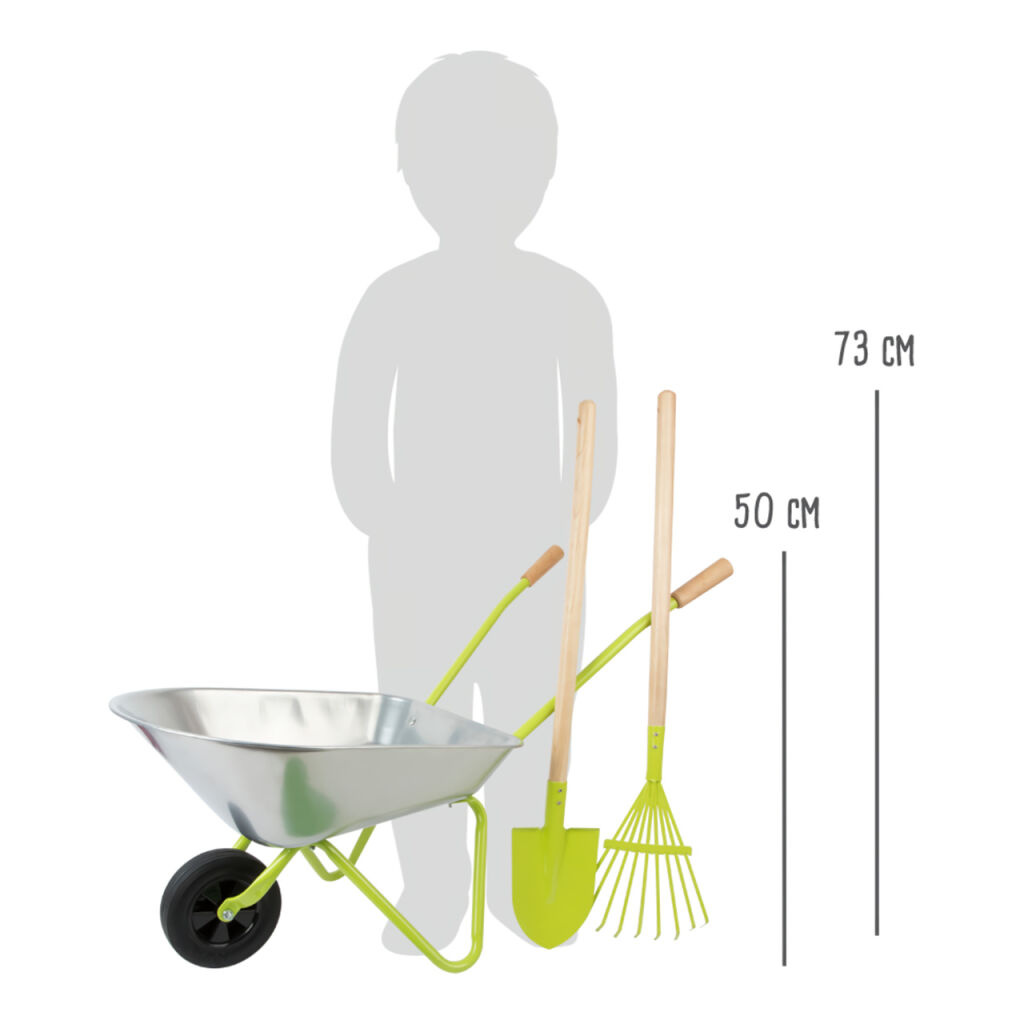Perfektní vybavení pro práci na zahradě! Kolečko má objem asi 10 litrů, s bavlněnými rukavicemi, lopatou a hrabkami pak děti mohou rodičům vypomoci na zahradě.