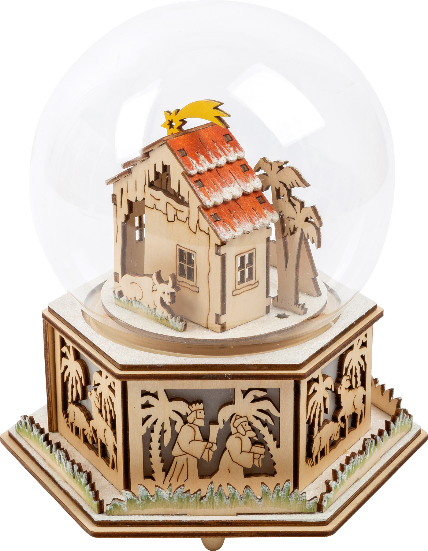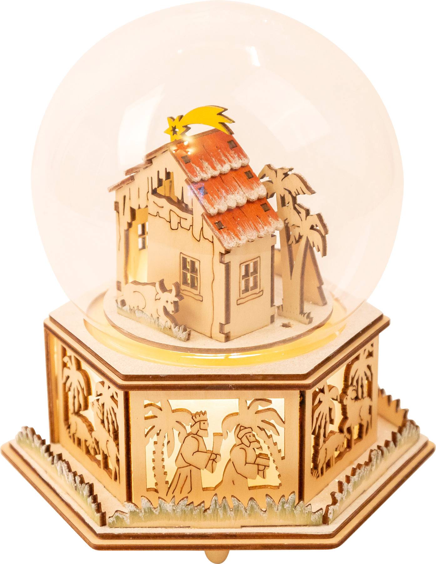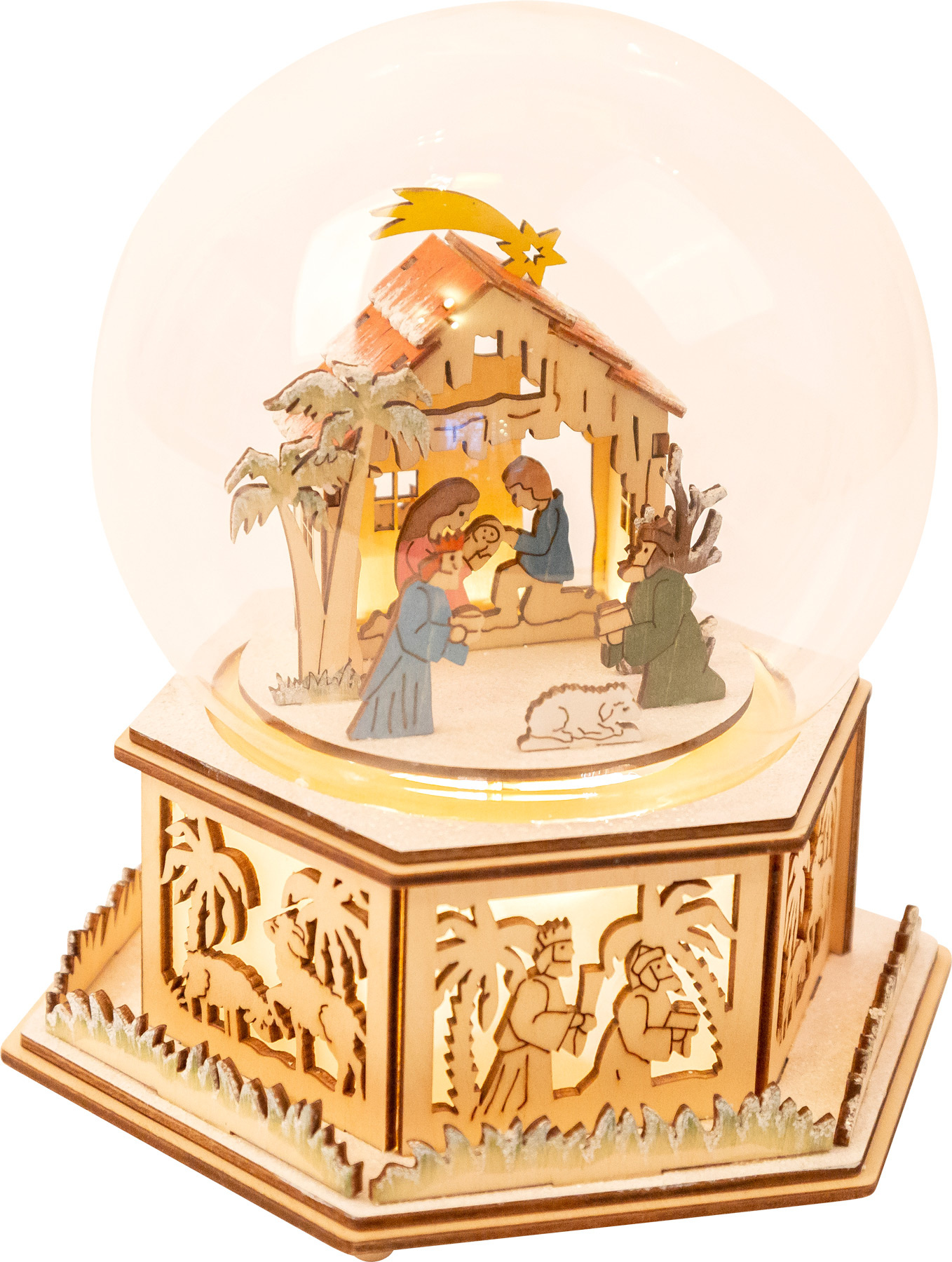 Tato krásná světelná dekorace je vyrobena z kvalitního dřeva. Hudební skříňka s vánočním motivem betlému hraje melodii "Tichá noc". Zatímco hraje hudba, rozsvícená sváteční koule vydává tlumené světlo. Baterie nejsou součástí balení.