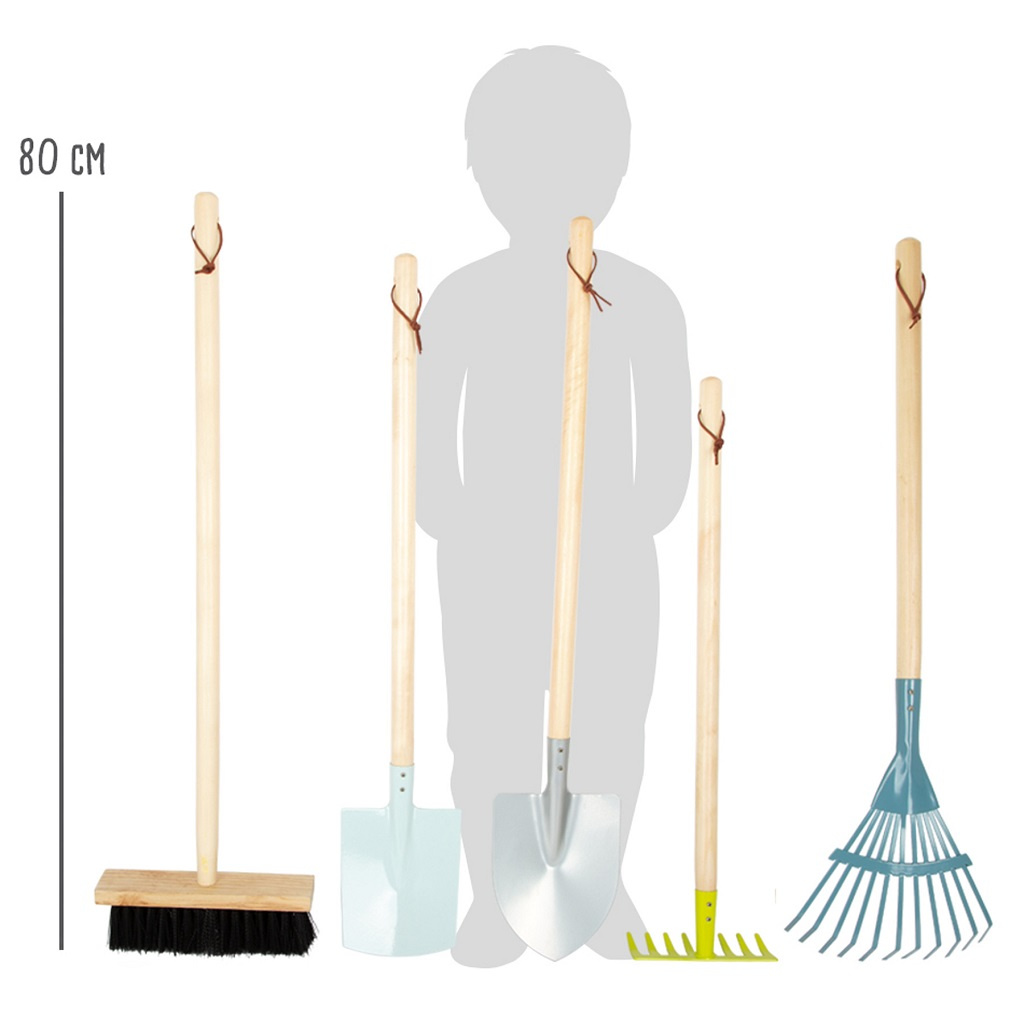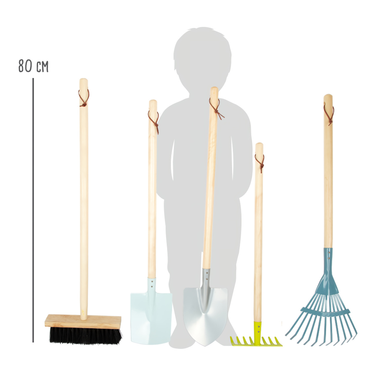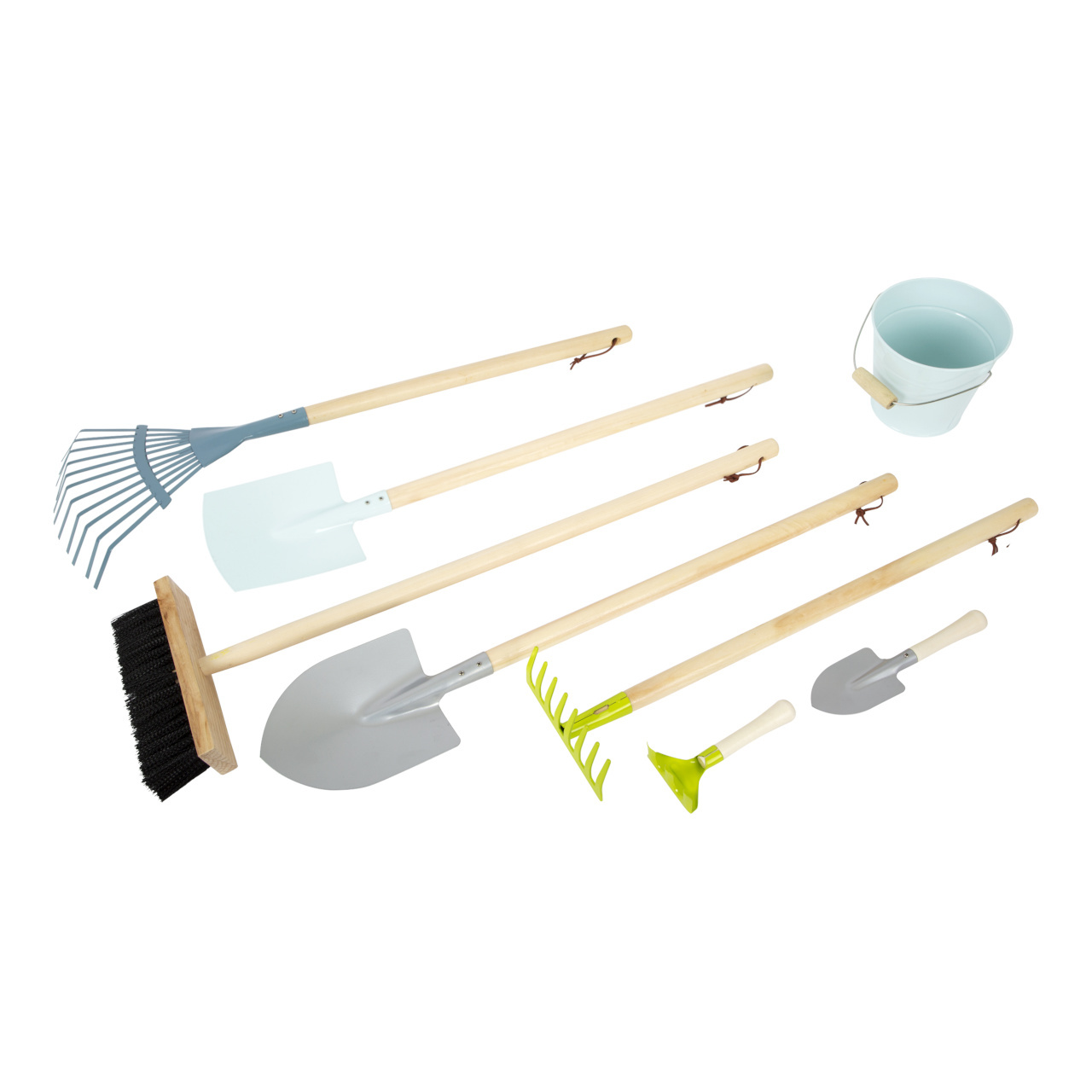 Tato komplexní sada zahradního nářadí v moderních barvách se skládá z rýče, lopaty, hrábek, košťete, lopaty a dvou malých zahradnických nástrojů pro práci na zahradě. Po dokončení práce lze nástroje z robustního dřeva a kovu řádně zavěsit na praktické smyčky. Tato sada je skutečná „nutnost“ pro všechny mladé zahradní pomocníky. Oblíbená moderní, komplexní sada pro váš sortiment venkovního zahradního nářadí.