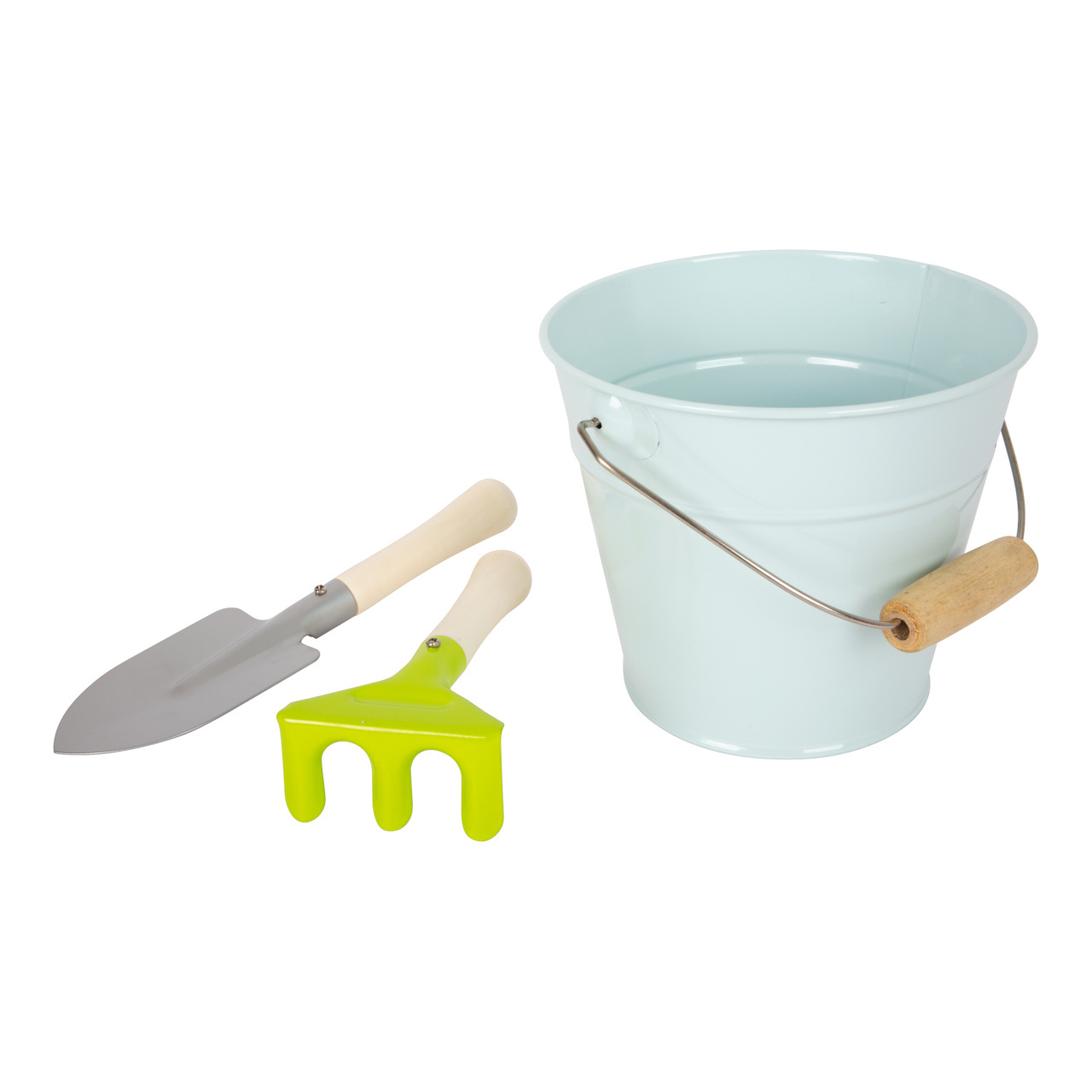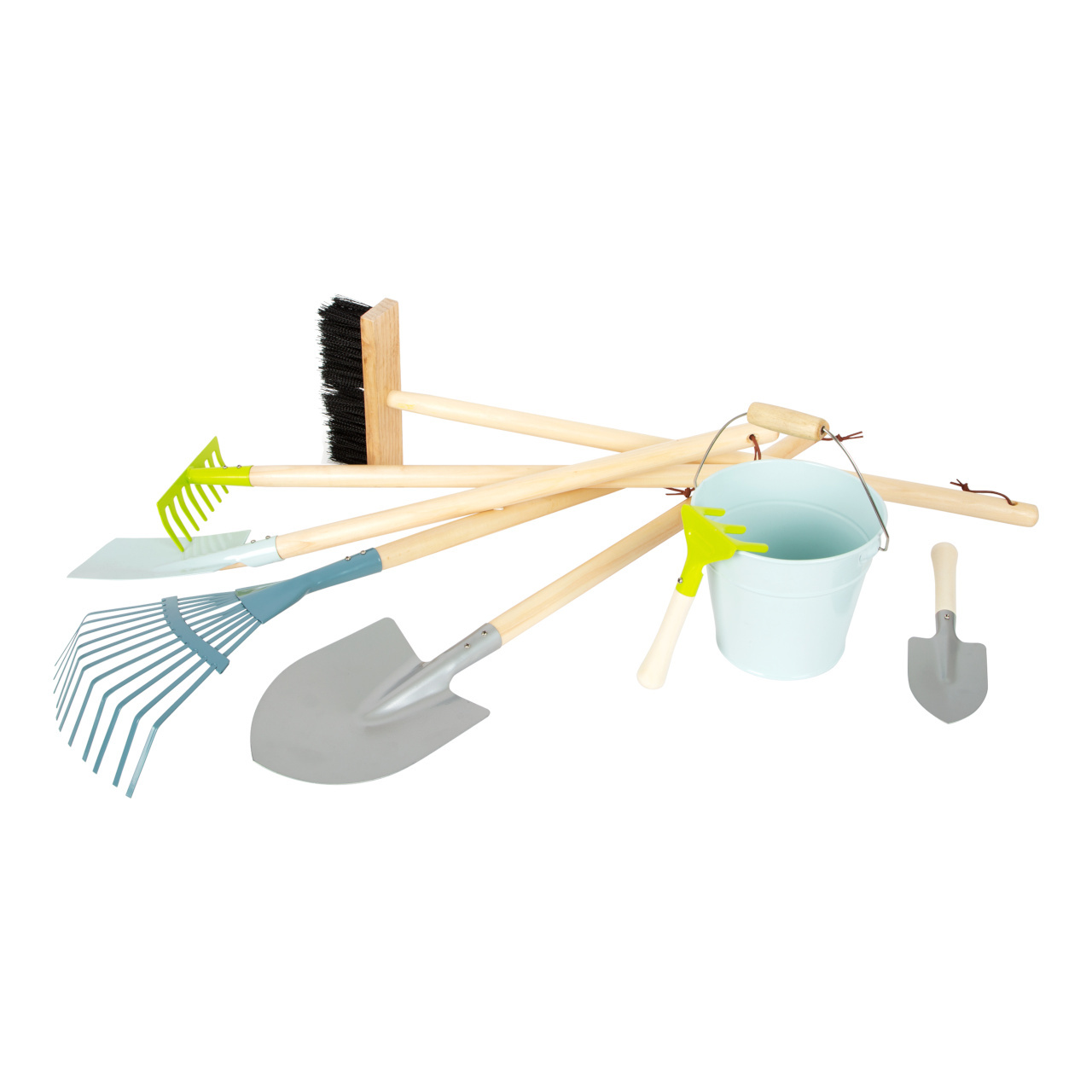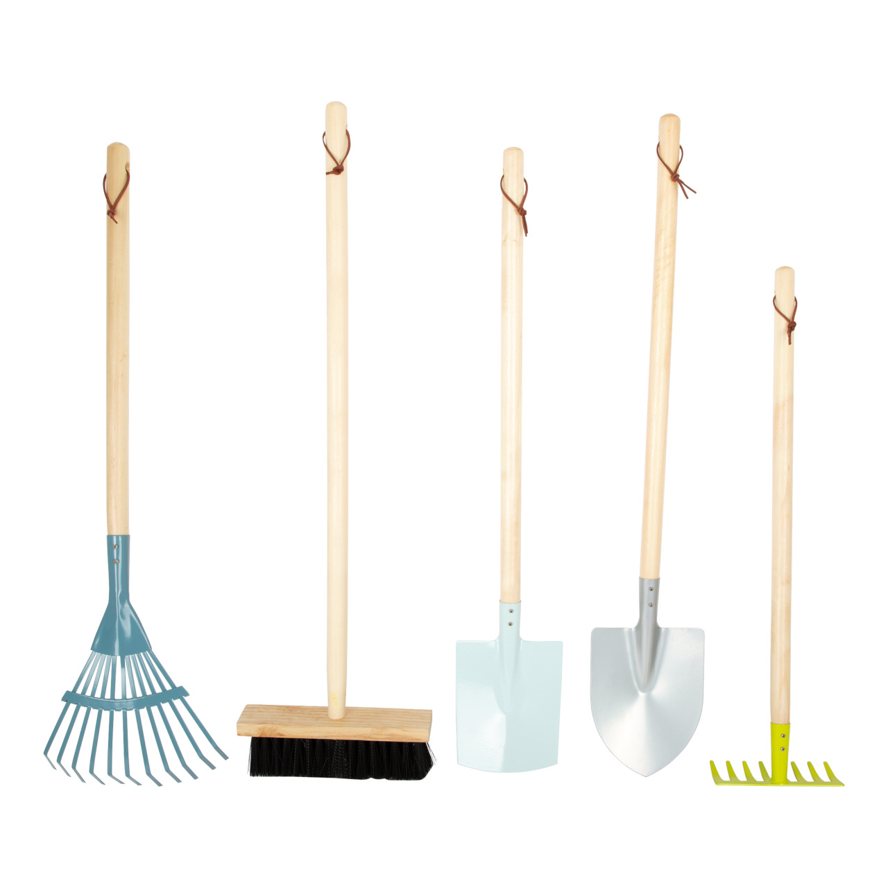 Tato komplexní sada zahradního nářadí v moderních barvách se skládá z rýče, lopaty, hrábek, košťete, lopaty a dvou malých zahradnických nástrojů pro práci na zahradě. Po dokončení práce lze nástroje z robustního dřeva a kovu řádně zavěsit na praktické smyčky. Tato sada je skutečná „nutnost“ pro všechny mladé zahradní pomocníky. Oblíbená moderní, komplexní sada pro váš sortiment venkovního zahradního nářadí.