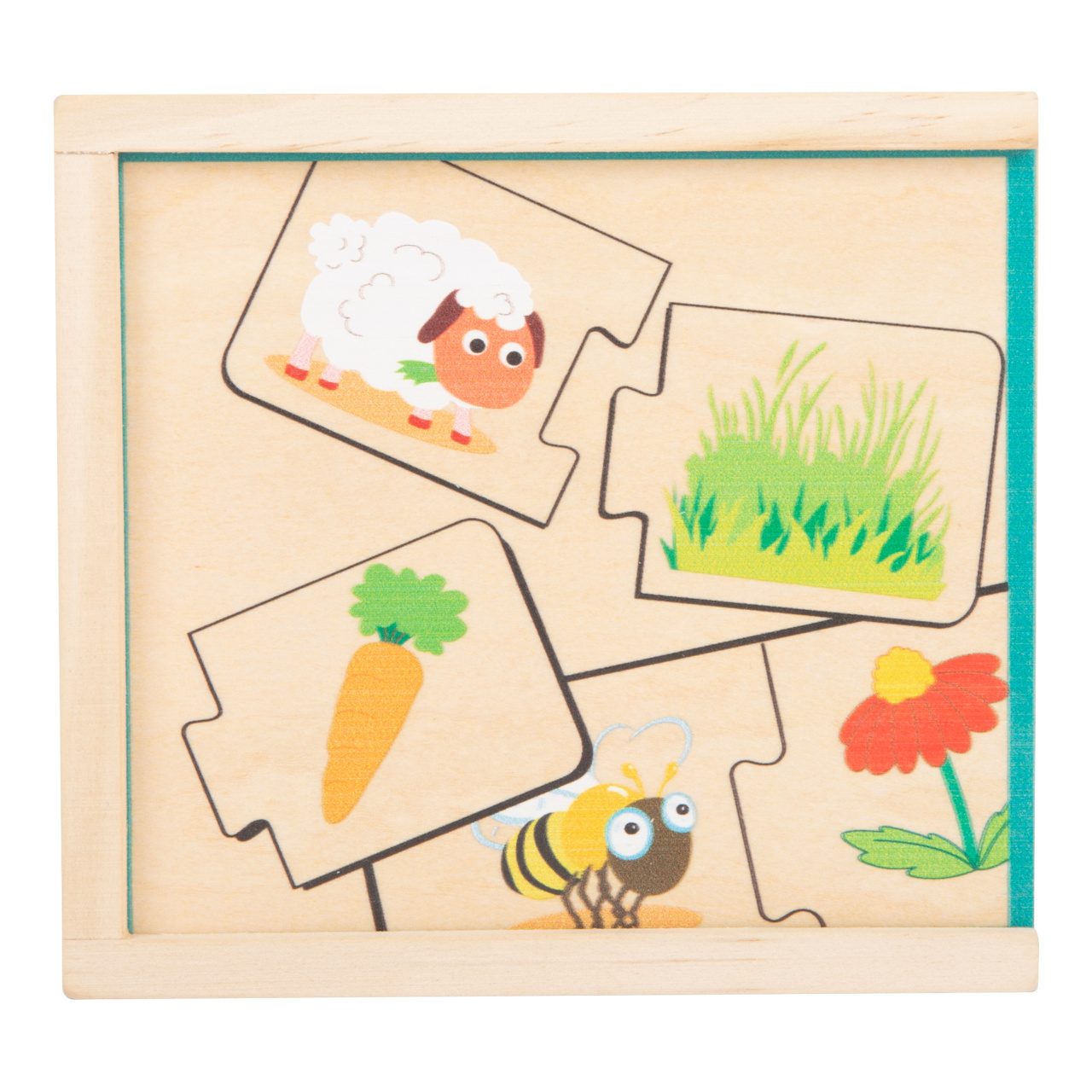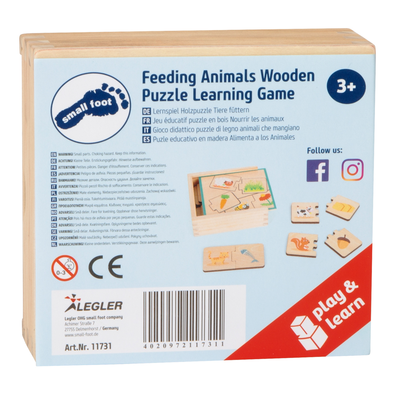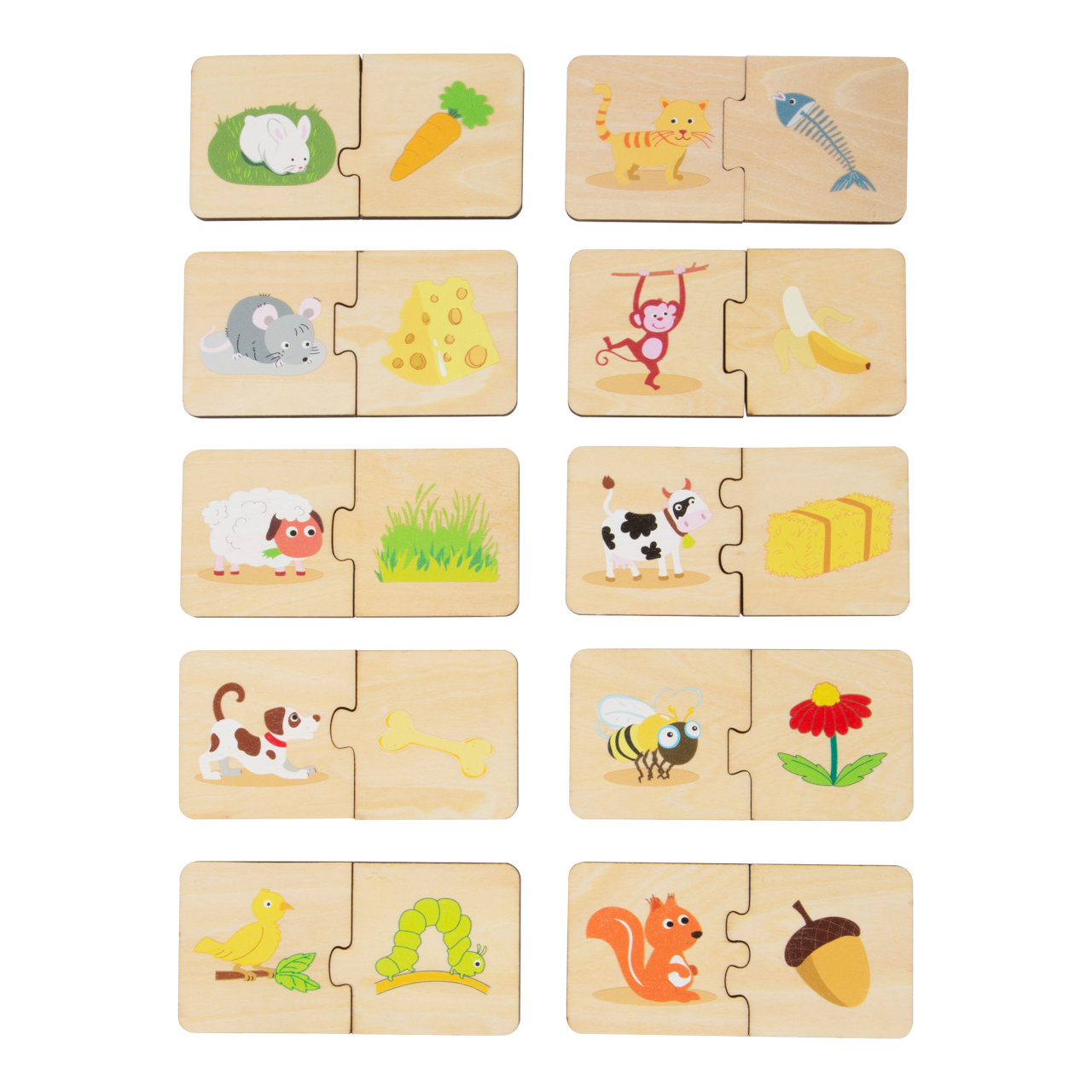 Kdo co jí? S tímto dřevěným puzzle budete mít za úkol přiřadit zvíře k potravě. Unikátní dílky puzzle dětem dovolí sestavit pouze správné kombinace. Hra 3v1 – puzzle můžete použít také jako pexeso, z 20 dílků uděláte 10 párů. Vše je uloženo v dřevěné krabičce s posuvným víkem. Ideální také na cesty.