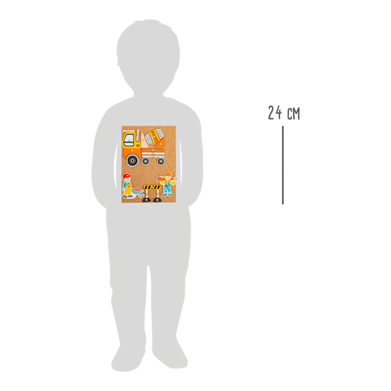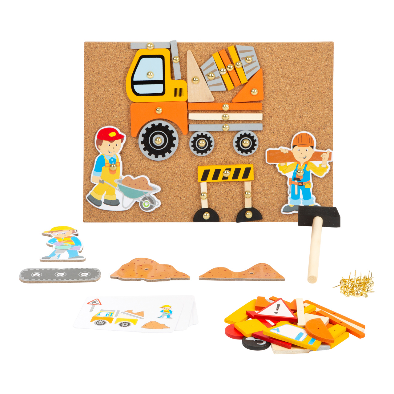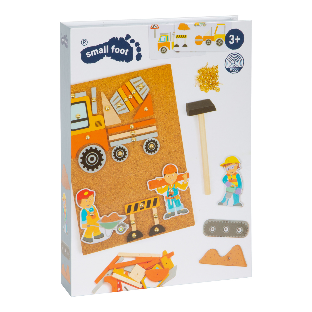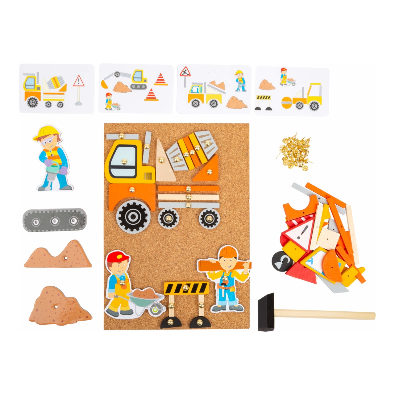 Doprava je zábava! Zatloukačka s kladivem a připínáčky. V balení najdete korkovou desku, kladivo, připínáčky a dřevěné objekty různých tvarů. Děti si mohou na desce/nástěnce díky zatlkoukačce vytvořit různé obrázky. Ať je to stavař, míchačka nebo jeřáb, tato sada obsahuje vše k vytvoření kouzelného obrazu. V balení najdete také obrázkové předlohy, z kterých se děti mohou inspirovat. Tato hra podporuje rozvoj kreativity a dá dětem vlastní prostor pro tvoření. Vše je zabaleno v praktickém boxu a tak se vám nic ze sady neztratí!