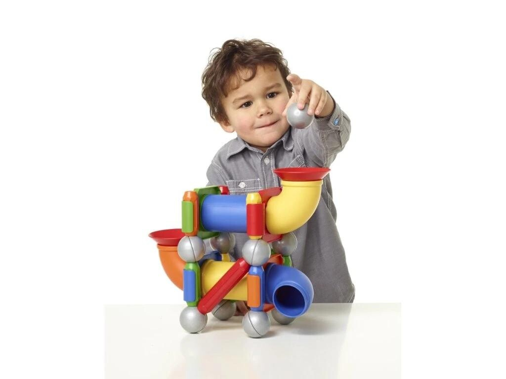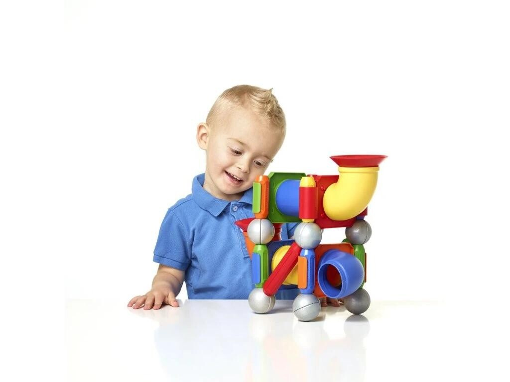 Tato magnetická stavebnice představuje ideální hračku pro malé děti od 2 let. Přitahování a odpuzování magnetů je ohromí na jejich cestě za poznáním. Starší děti mohou budovat věže, mosty a další super velké stavby. Jednotlivé magnetické díly se jednoduše spojují jedním kliknutím. Všechny díly lze kombinovat se všemi stavebnicemi SmartMax. Tato sada obsahuje 2 dlouhé tyče, 8 středně dlouhých tyček, 3 zakřivené trubky, 2 rovné trubky, 2 trychtýře, 9 kovových kuliček a 4 panely s otvory.
