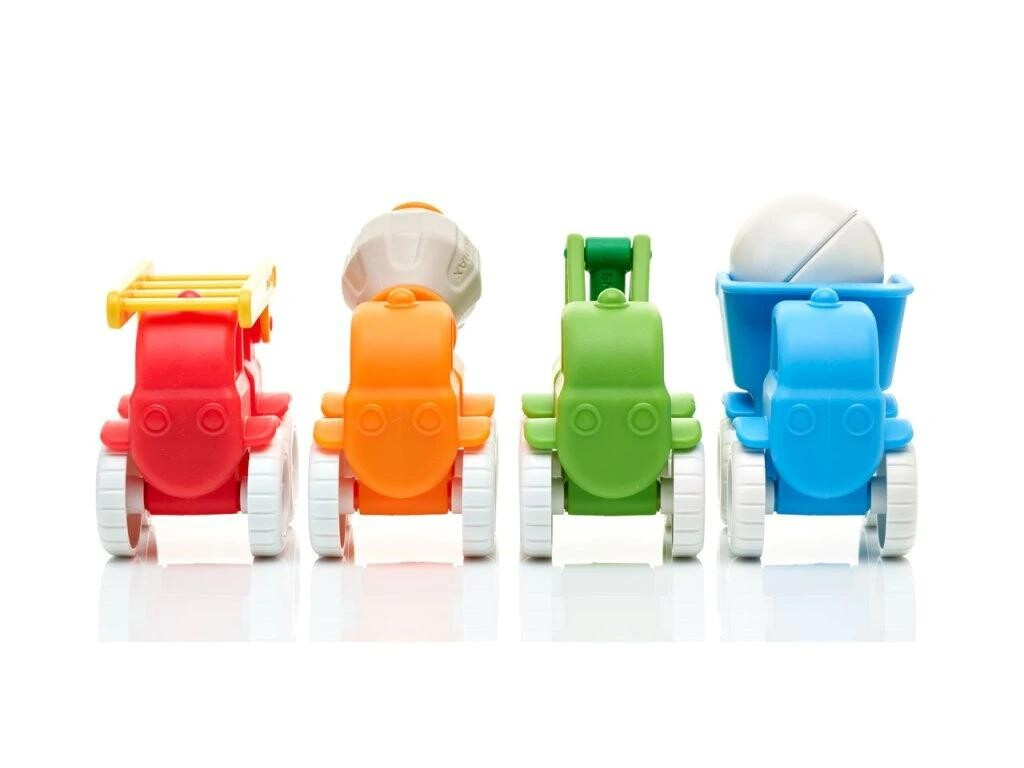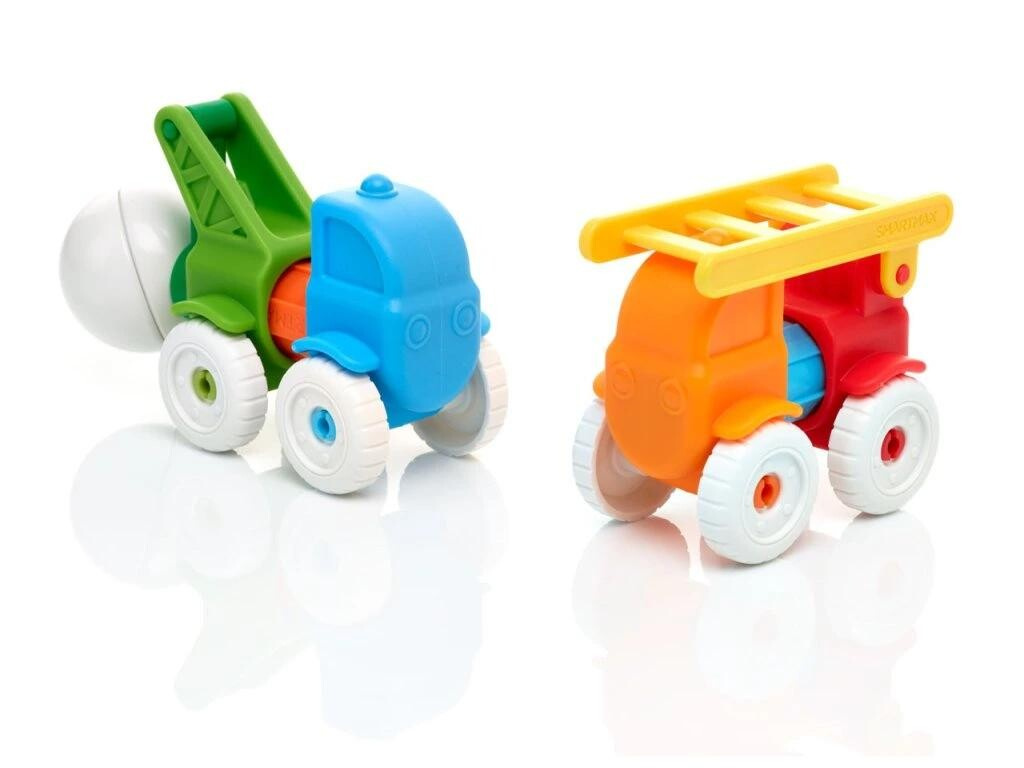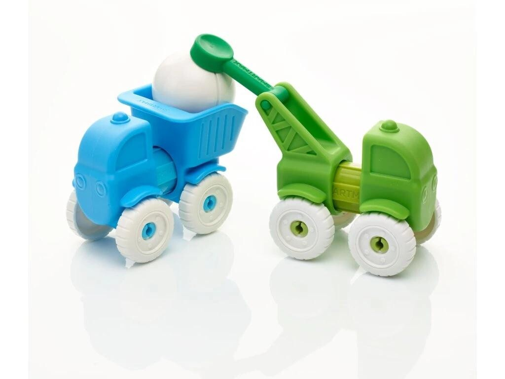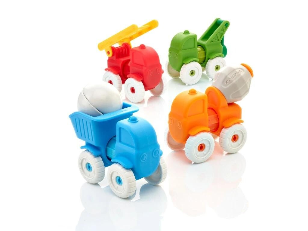 Sada 4 magnetických tyček a nasazovacích předních a zadních částí autíček ve čtyřech různých barvách. Děti si tak snadno sestaví 4 různá autíčka: hasičské auto, náklaďák, míchačku a nakladač. Na hraní mají také k dispozici jednu magnetickou kouli, která poslouží nejen jako náklad do náklaďáku, ale také umožňuje sadu použít jako první malou stavebnici. Dílky jsou dostatečně velké, příjemné a snadné na manipulaci. Ideální jednoduchá stavebnice pro malé děti od 1 roku, která využívá ke spojování jednotlivých částí magnetismus. Balení obsahuje celkem 13 dílků: 4 magnetické tyčky, 4 přední a 4 zadní díly autíček a 1 magnetickou kouli.
