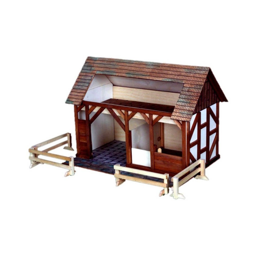 Dřevěná slepovací stavebnice Walachia - Stáj. Slepovací stavebnice Walachia jsou dřevěné modely domečků a staveb z Valašského kraje v měřítku 1:32. Základem jsou dřevěné hranolky 9x9 mm a k tomu jsou v sadě vždy všechny papírové doplňky - okna, dveře, střešní části atd. Pro lepení se používá lepidlo Herkules, není však součástí stavebnice. Přiložený je montážní návod a malé kapitoly z historie lidové architektury. Rozměry: 39 x 25 x 28 cm. Počet dílů stavebnice: 154