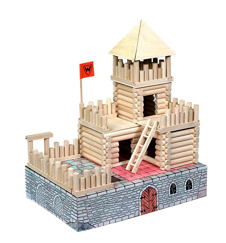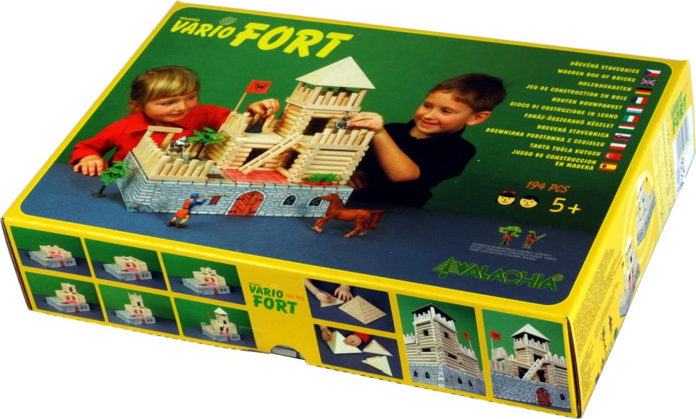 VARIO Fort je krásná stavebnice středověkého hradu z masivního bukového dřeva, která se určitě zalíbí každému malému staviteli. Stavebnice VARIO obsahuje skládací a rozkládací modely staveb, zhotovené z hlazených bukových kulatin o průměru 15 mm, v délkách od 28 do 250 mm, opatřených frézovanými půlkulatými zámky. Jsou navzájem kompatibilní a umožňují postavit desítky variant staveb. Okna a dveře, slepené z masivních profilů, se vkládají do stěn staveb. Jsou uloženy v pevných kartónových krabicích, které zajišťují jejich dlouholetou životnost.