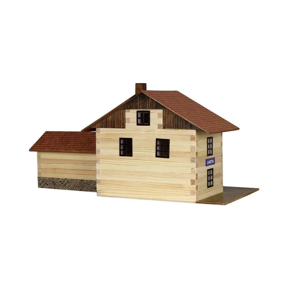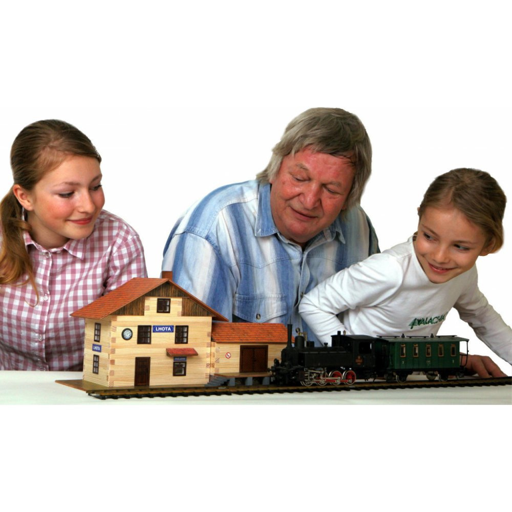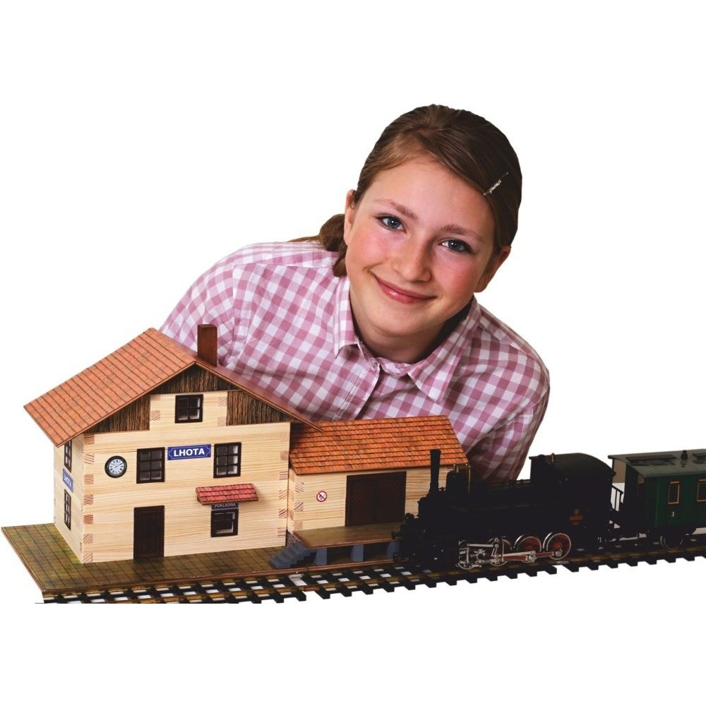 Stavebnice se skládá z 213 dílků a naleznete v ní všechno potřebné k sestavení. Součástí stavebnice jsou dřevěné hranolky o průřezu 9×9 mm daných délek ke stavbě roubených stěn, díly na štíty a střechy, kartonové výseky oken a dveří i barevné papírové potisky, plochy štítů, střech, stříšek, dveří, oken a dlažeb, folie oken a brusný papír na opracování dřevěných dílů (kvalita ploch však opracování potřebuje minimálně). Součástí stavebnice je podrobný schématický montážní plán. Stavebnice se slepuje lepidlem na dřevo nebo papír. Lepidlo není součástí balení. Železniční stanice je vyrobena v měřítku 1:45. Rozměry: 40 x 18 x 18 cm Věk: 8+