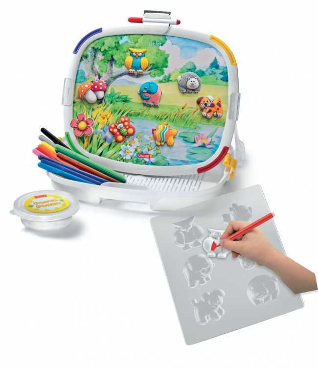 Se soupravou Tablet Creativo můžete vytvářet úžasné magnetky, které je možné připevňovat na oboustrannou tabulku nebo kamkoli jinam – třeba na lednici v kuchyni. Díky kouzelné hmotě Pasta Panna, která se snadno tvaruje, je lehká jako pírko a nelepí se na ruce ani na formy, je pro děti snadné vytvářet fantastická zvířátka, jež pak mohou dle svého uvážení pomalovat přiloženými fixy. Jedna strana tabulky představuje barevnou scenérii, v níž se mohou odehrávat nekonečné příběhy zvířátek řízené jen dětskou fantazií. Tato kreativní hračka tak během dlouhých hodin zcela bezpečného hraní rozvíjí manuální zručnost a představivost vašich dětí.