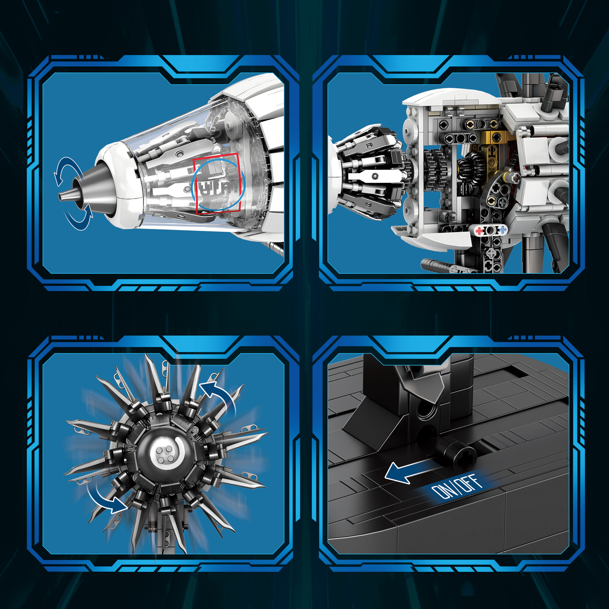 - Funkční převodový mechanismus – vnitřní soustava převodů simuluje vysokorychlostní otáčení ventilátoru.