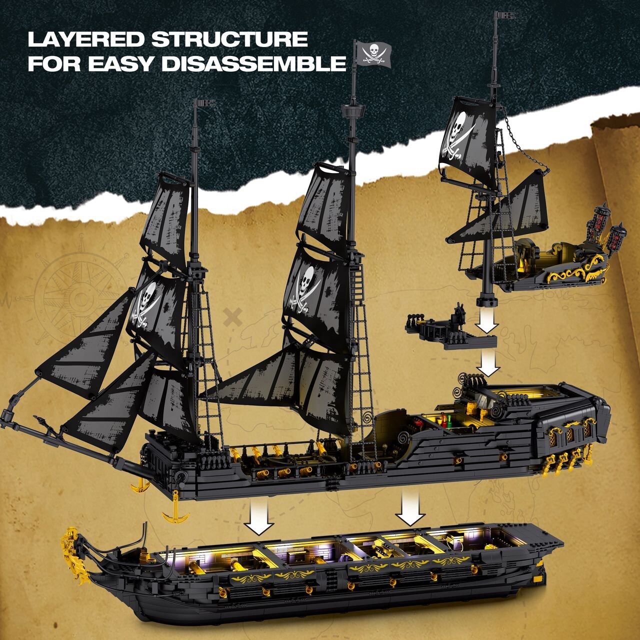 Loď v temném černém provedení s charakteristickými plachtami se znakem lebky a zkřížených hnátů působí impozantně na každém vystaveném místě. Nechybí děla, stožáry, kotevní řetězy ani realistická paluba – každý detail je vytvořen s důrazem na autenticitu.
