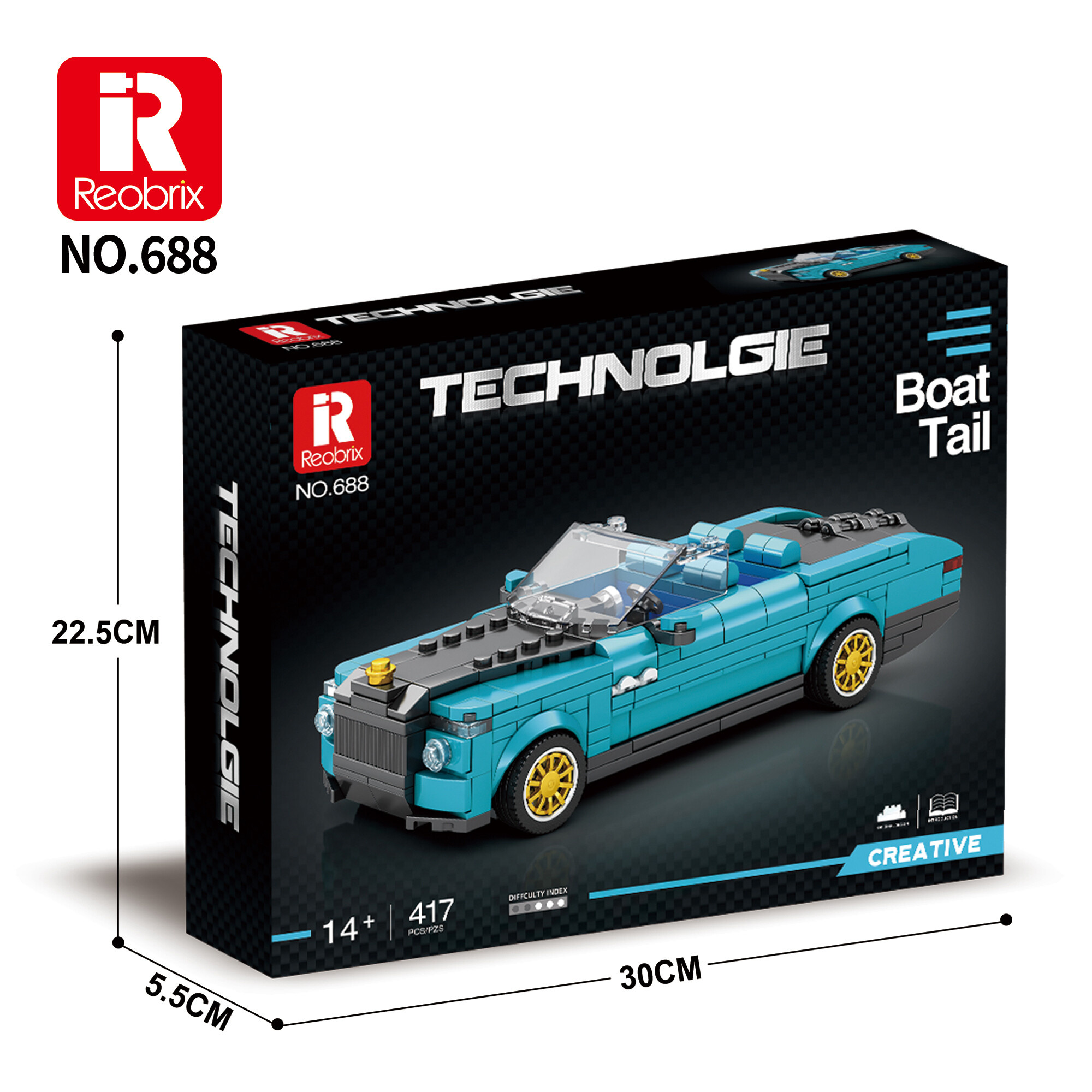 Postavte si vlastní miniaturu automobilové elegance! Reobrix Boat Tail je detailní model inspirovaný ikonickým luxusním vozem Rolls-Royce Boat Tail (bez licence), který spojuje výjimečný klasický design s precizním technickým zpracováním. Díky 417 dílkům vznikne propracovaný model s charakteristickými tvary, jemnými liniemi a autentickými proporcemi.