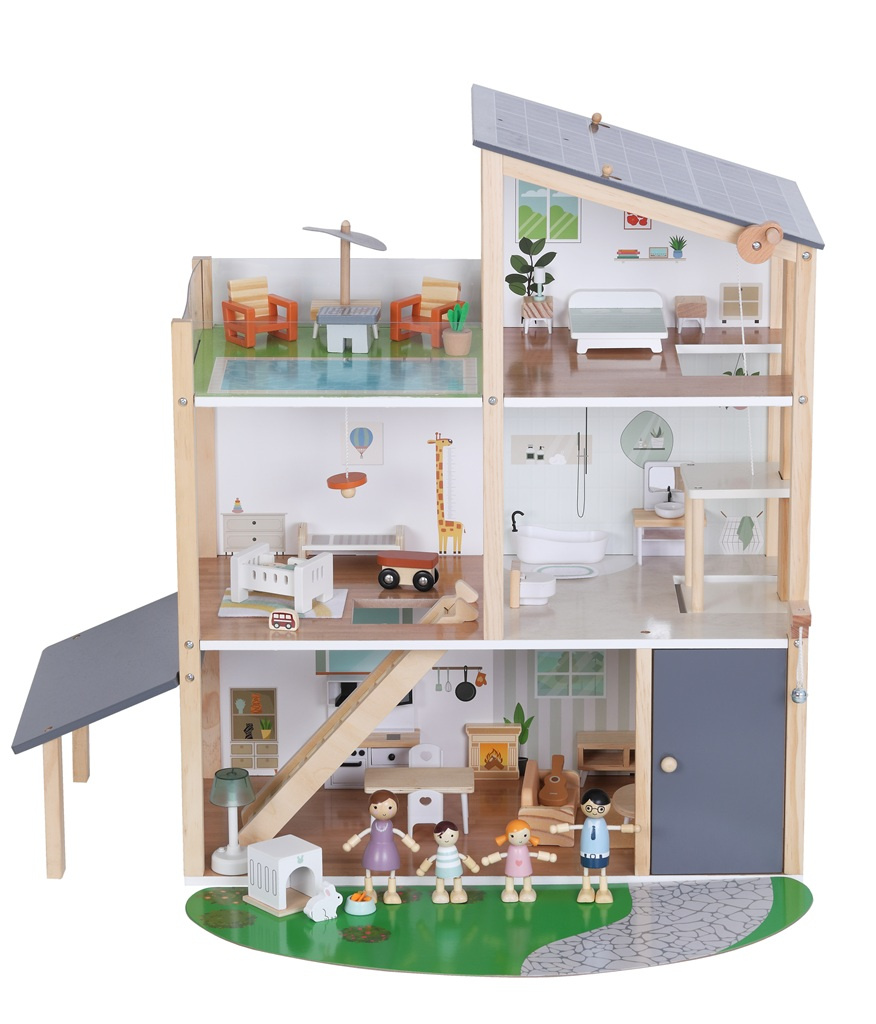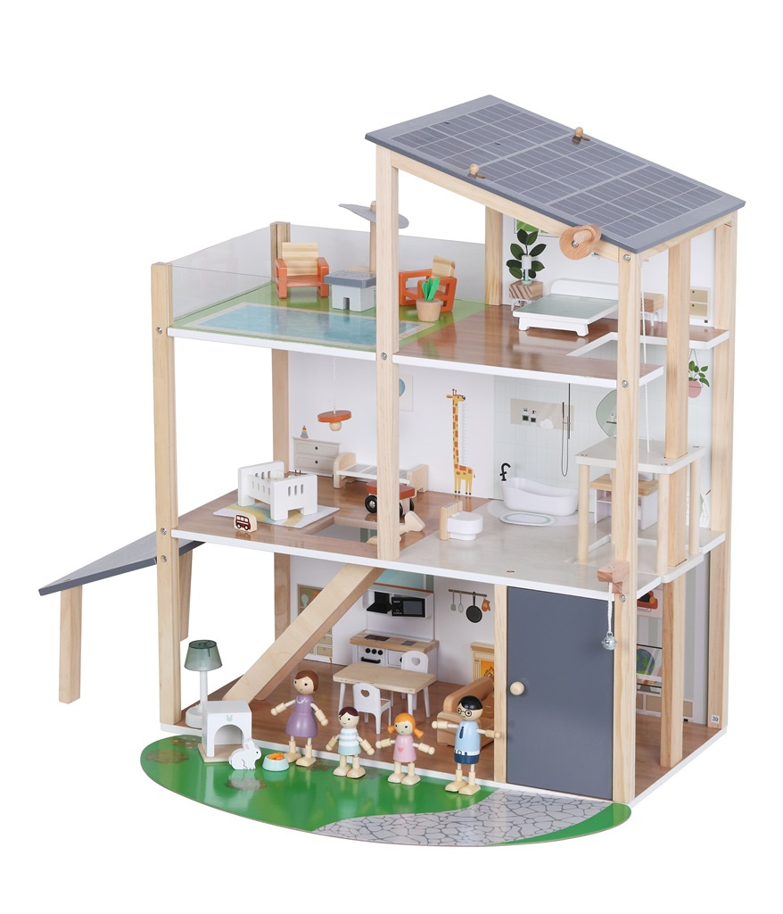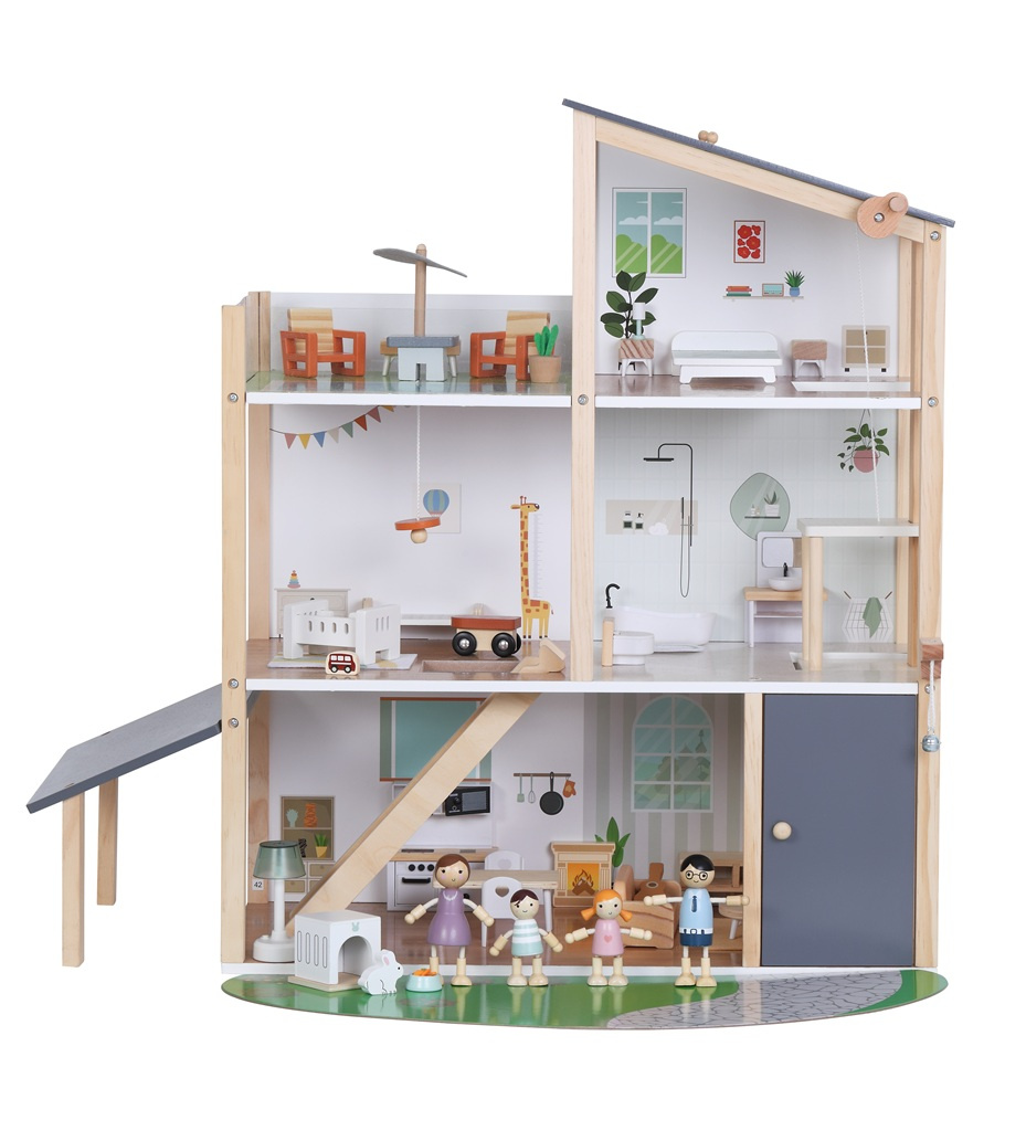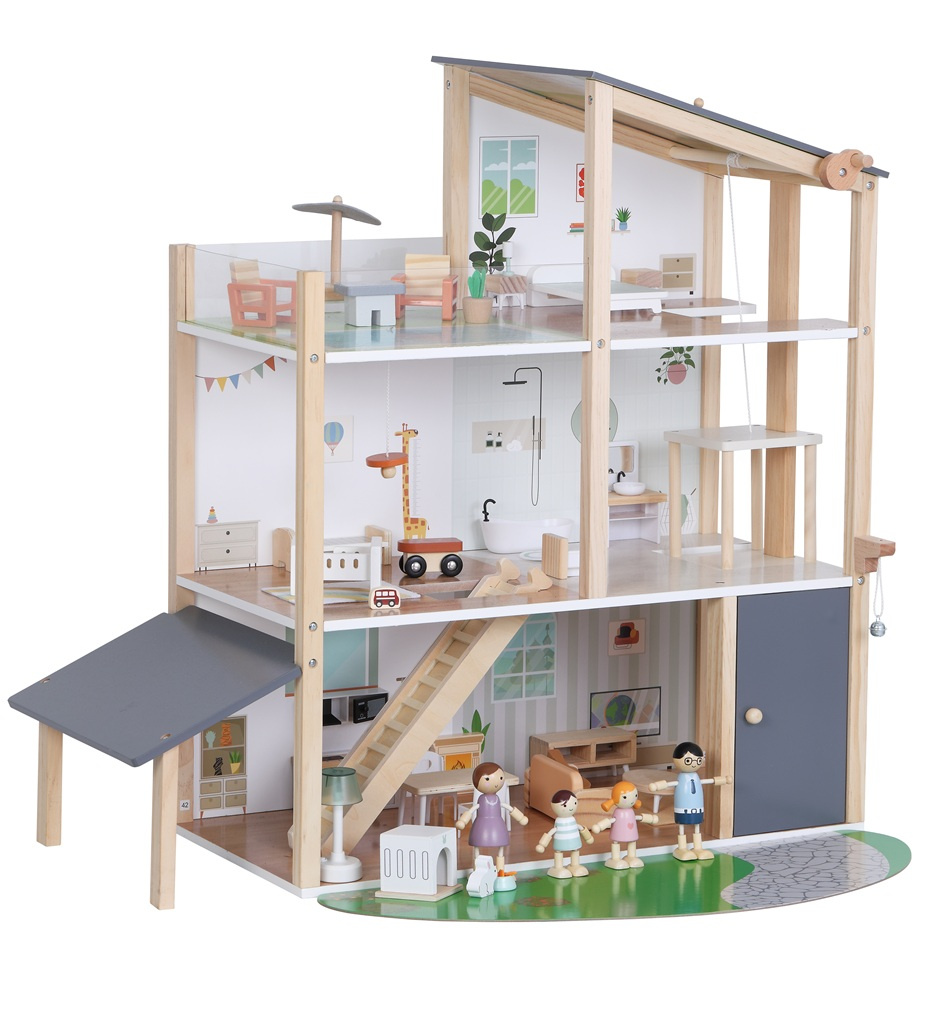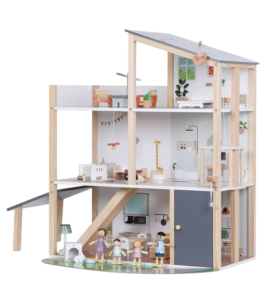 Vítejte v domečku, kde se bydlí jedna radost! Prostorný dřevěný domek je plně vybavený nábytkem i doplňky. Najdete v něm prostornou kuchyni propojenou s útulným obývacím pokojem, stylovou koupelnu s vanou, dětský pokojíček, ložnici i luxusní střešní terasu pro chvíle pohody. A aby toho nebylo málo, nechybí ani výtah. Zatočte kličkou a vyvezte rodinku až do druhého patra. Součástí sady je roztomilý domácí mazlíček králíček s vlastním domečkem a čtyřčlenná rodina připravená zabydlet se a začít psát svůj příběh. Děti si při hře rozvíjejí fantazii, sociální dovednosti i smysl pro detail. A hlavně se výborně baví!
