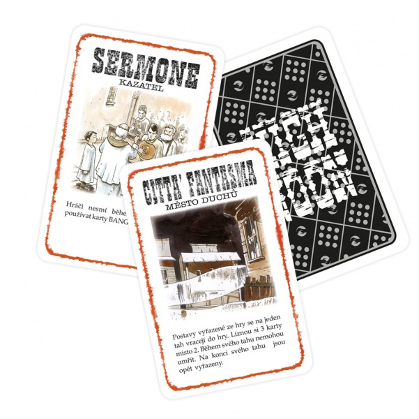Mesto duchov je rozšírenie k hre Bang! Táto kartová hra obsahuje 2 rozšírenia (v origináli vyšla pod názvami Dodge City a High noon) kompletne v českom jazyku. Do hry prichádzajú nové postavy, nové karty a s nimi aj nové možnosti. Nesmiete sa teda vôbec diviť, keď mŕtvi zrazu ožijú a prídu si vybaviť účty s tými, ktorí ich poslali do večných lovísk.