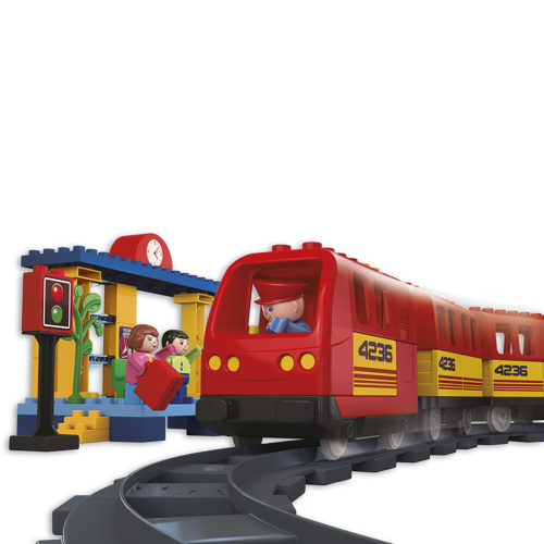 Postavte si farebný vláčik so zvukom na batériový pohon. Vláčik jazdí po koľajovom ovále s rozmermi 83 x 58 cm. Batérie nie sú súčasťou výrobku. Súčasťou ceny je recyklačný príspevok 0,5 Eur bez DPH.