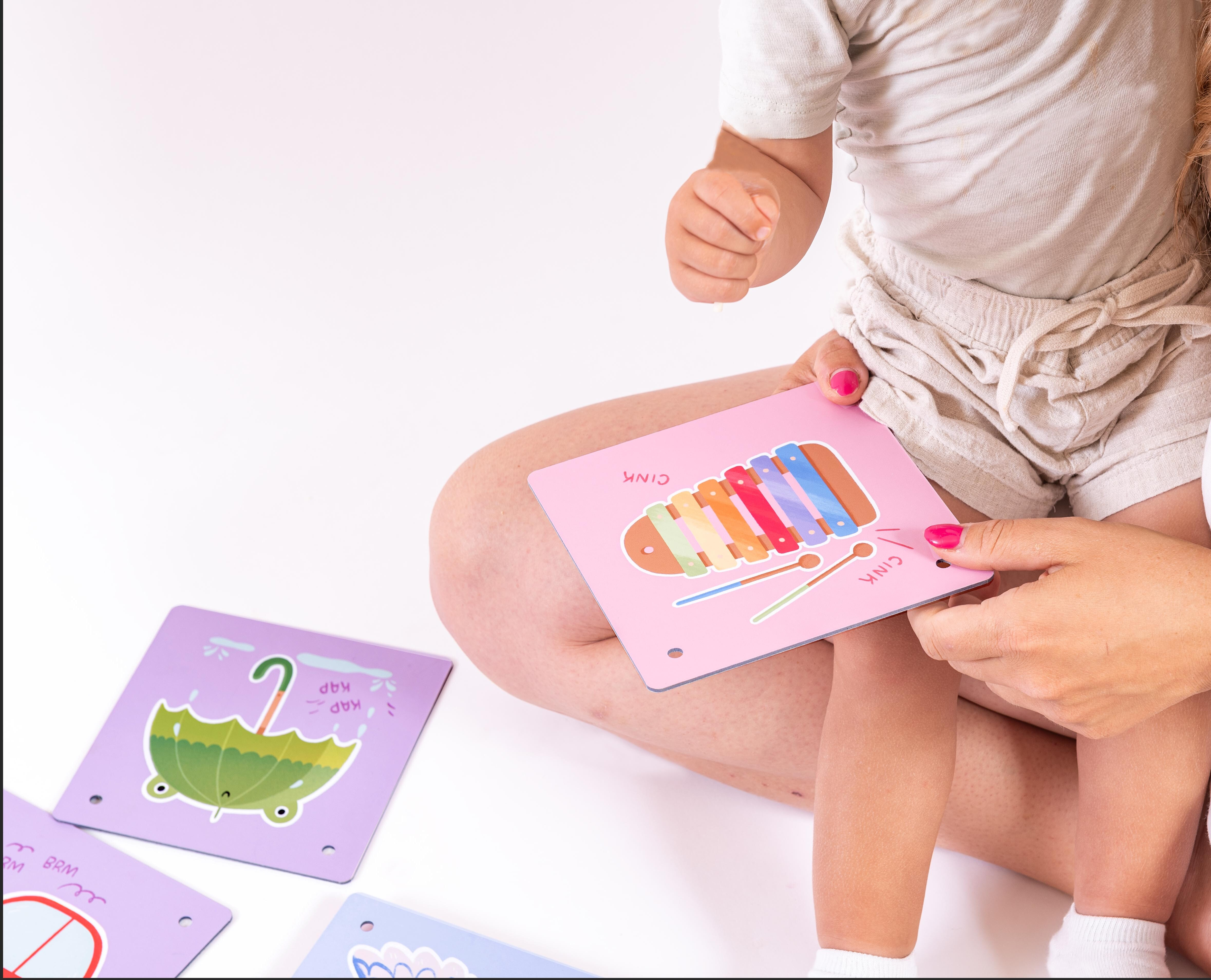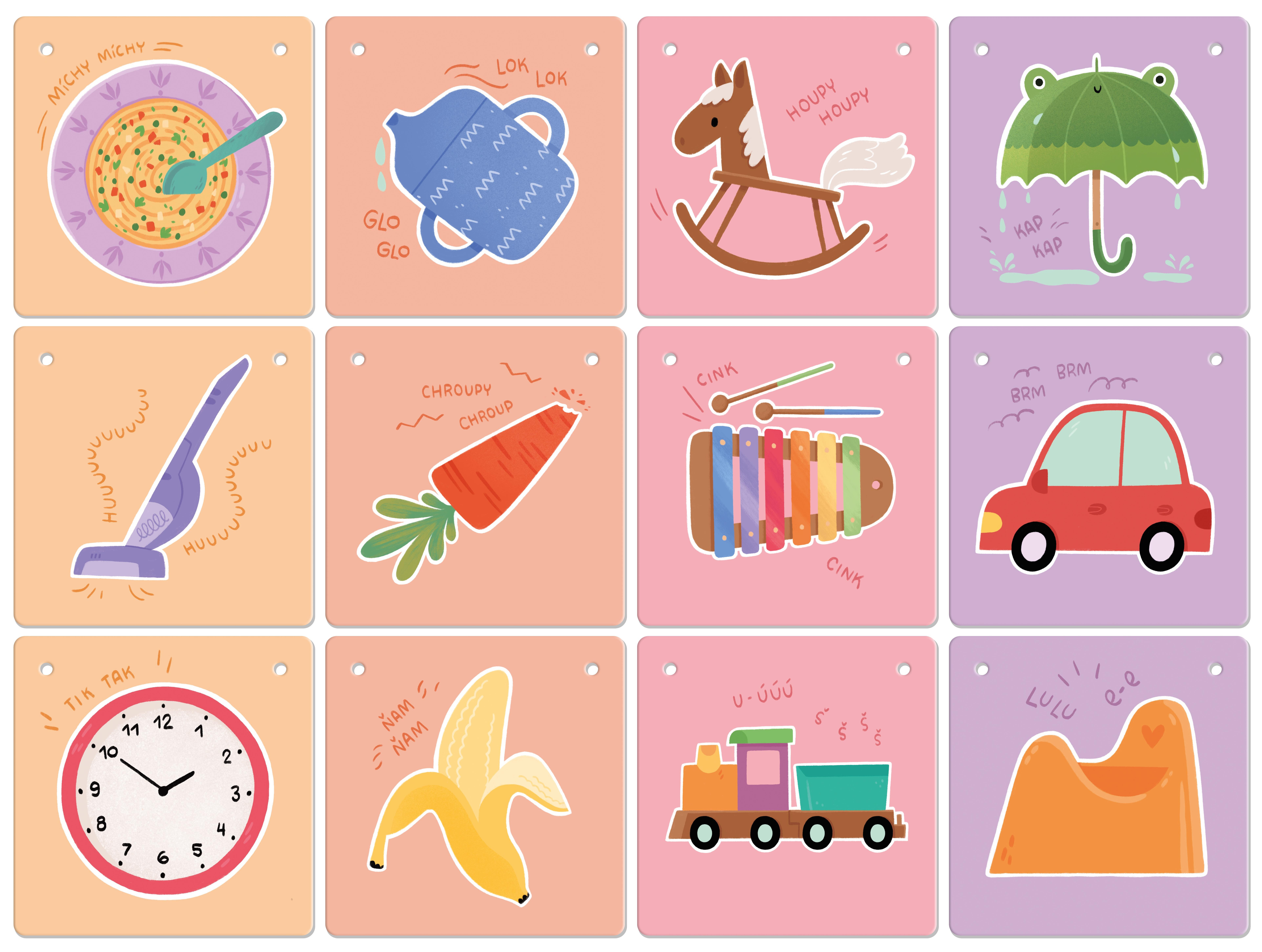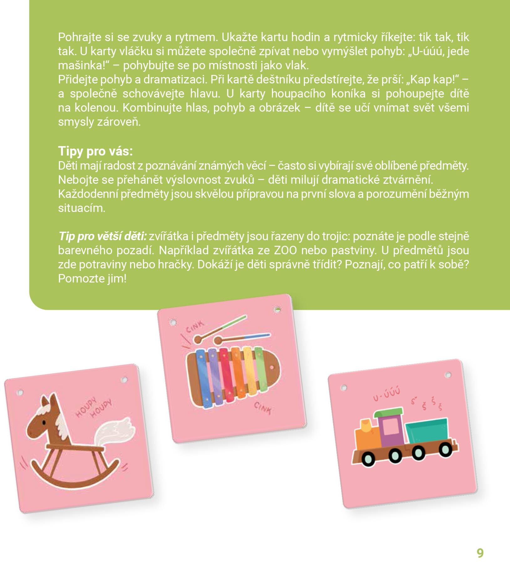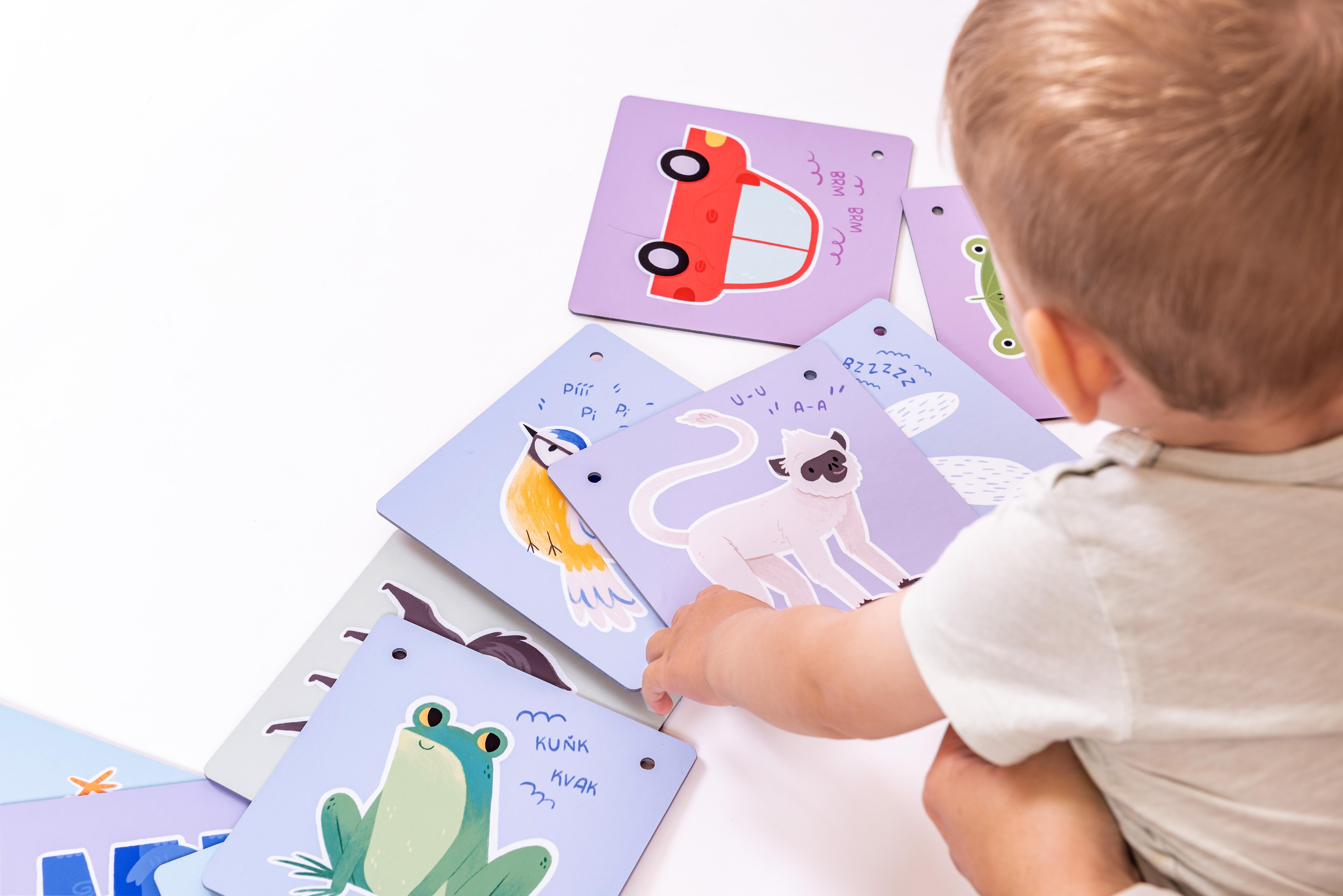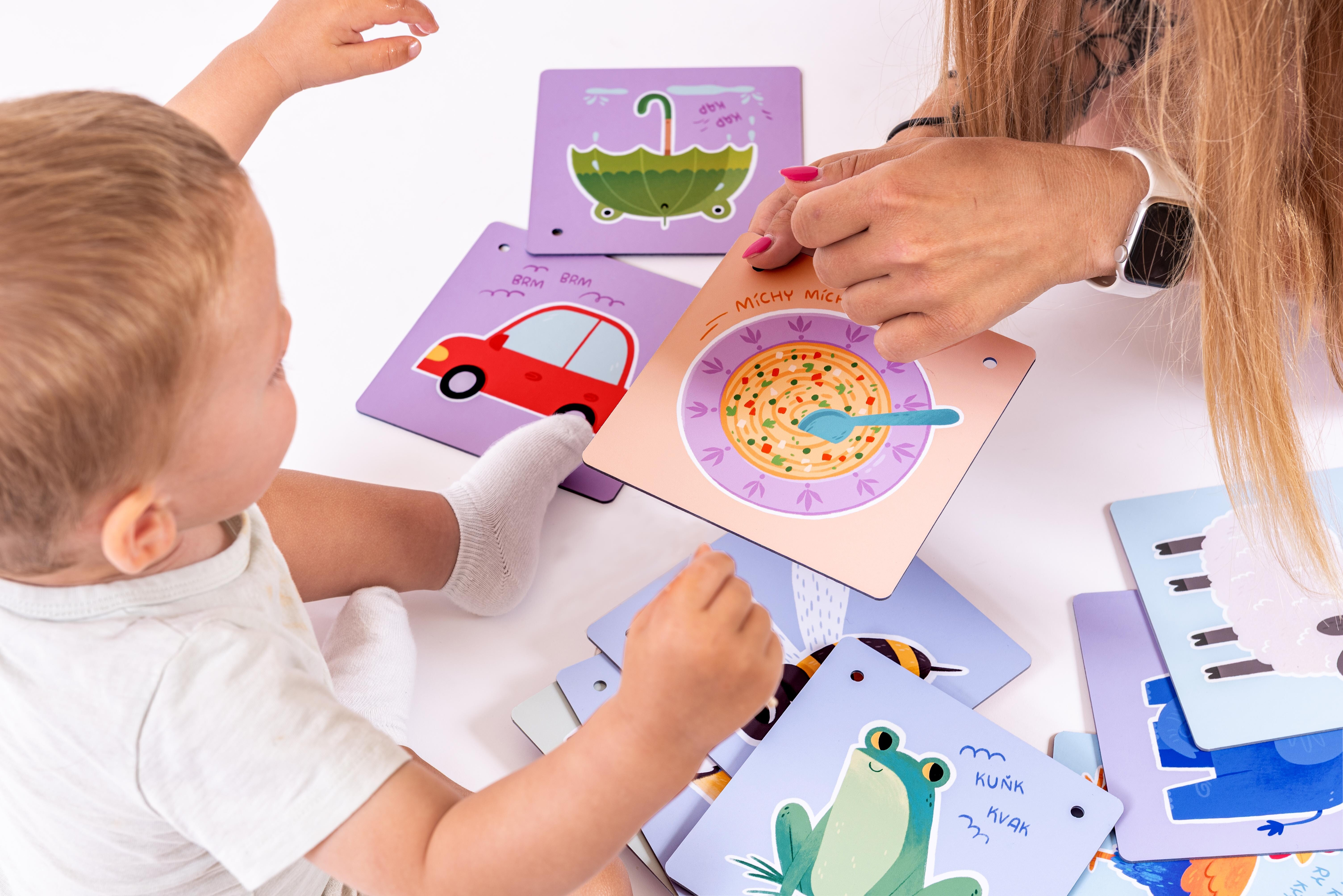 Ideálna pomôcka pred prvými slovami – dieťa môže na obrázky reagovať zvukom skôr, ako začne hovoriť. Súprava výborne nadväzuje na KukiKuk kontrastné karty pre bábätká.