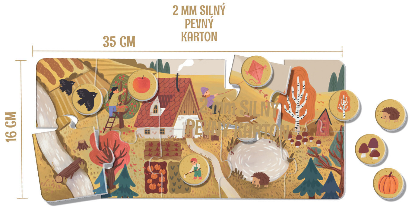 - 4 veľké desaťdielne puzzle (jar, leto, jeseň, zima) – celkom 40 dielikov, veľkosť každého puzzle 35 × 16 cm