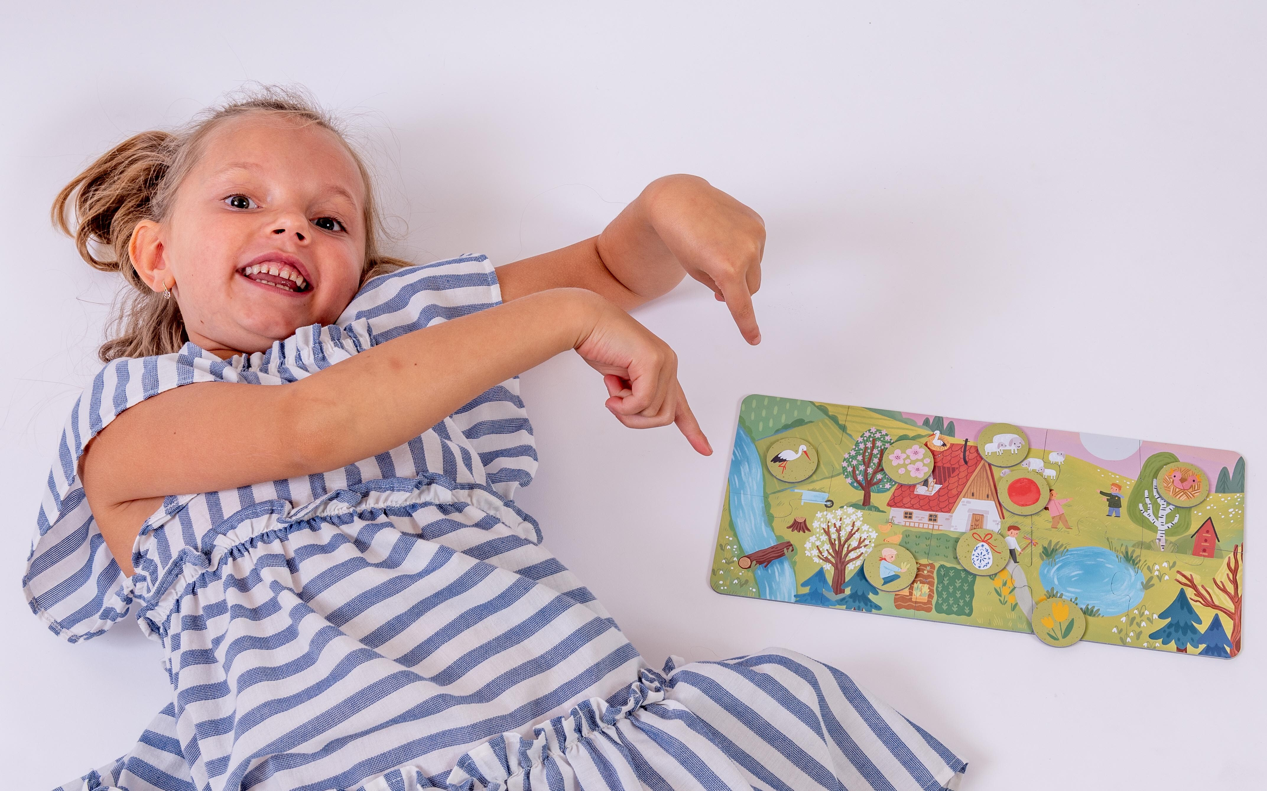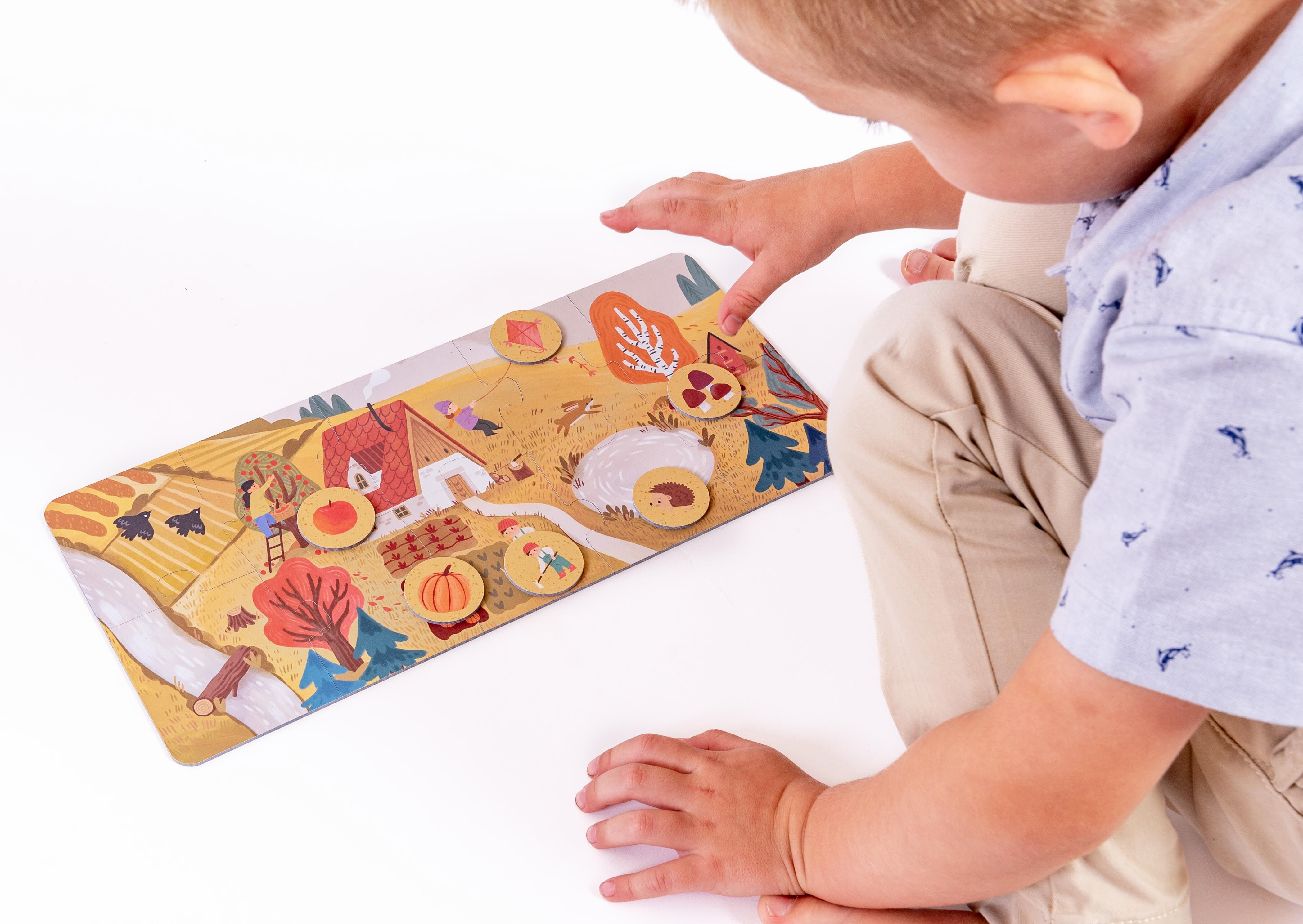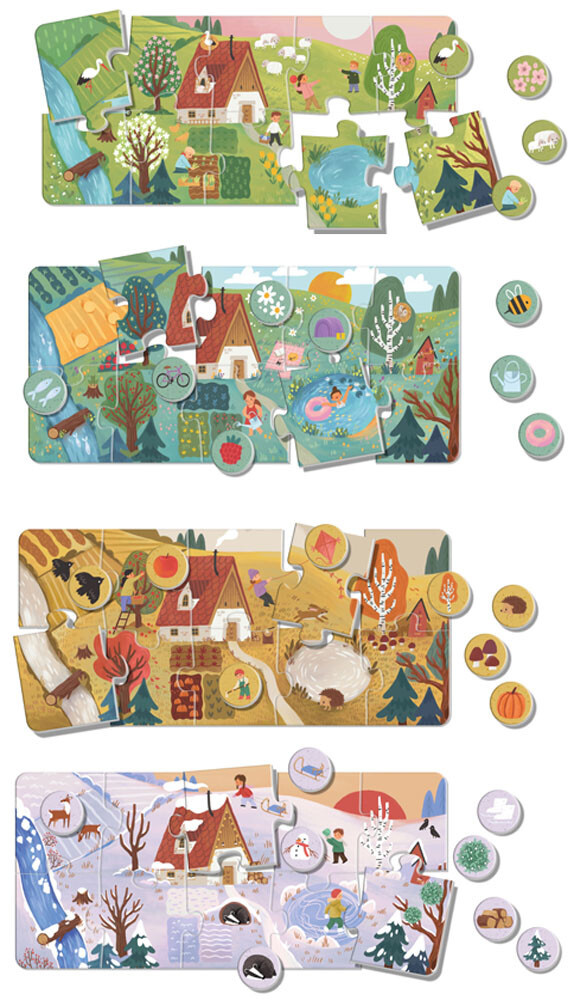 Táto hra prináša štyri krásne scény: jar, leto, jeseň a zimu. Každé obdobie deti skladajú z 10 veľkých dielikov ak hotovým obrázkom priraďujú 8 okrúhlych žetónov s motívmi z daného ročného obdobia – trénujú tak postreh aj logické myslenie.