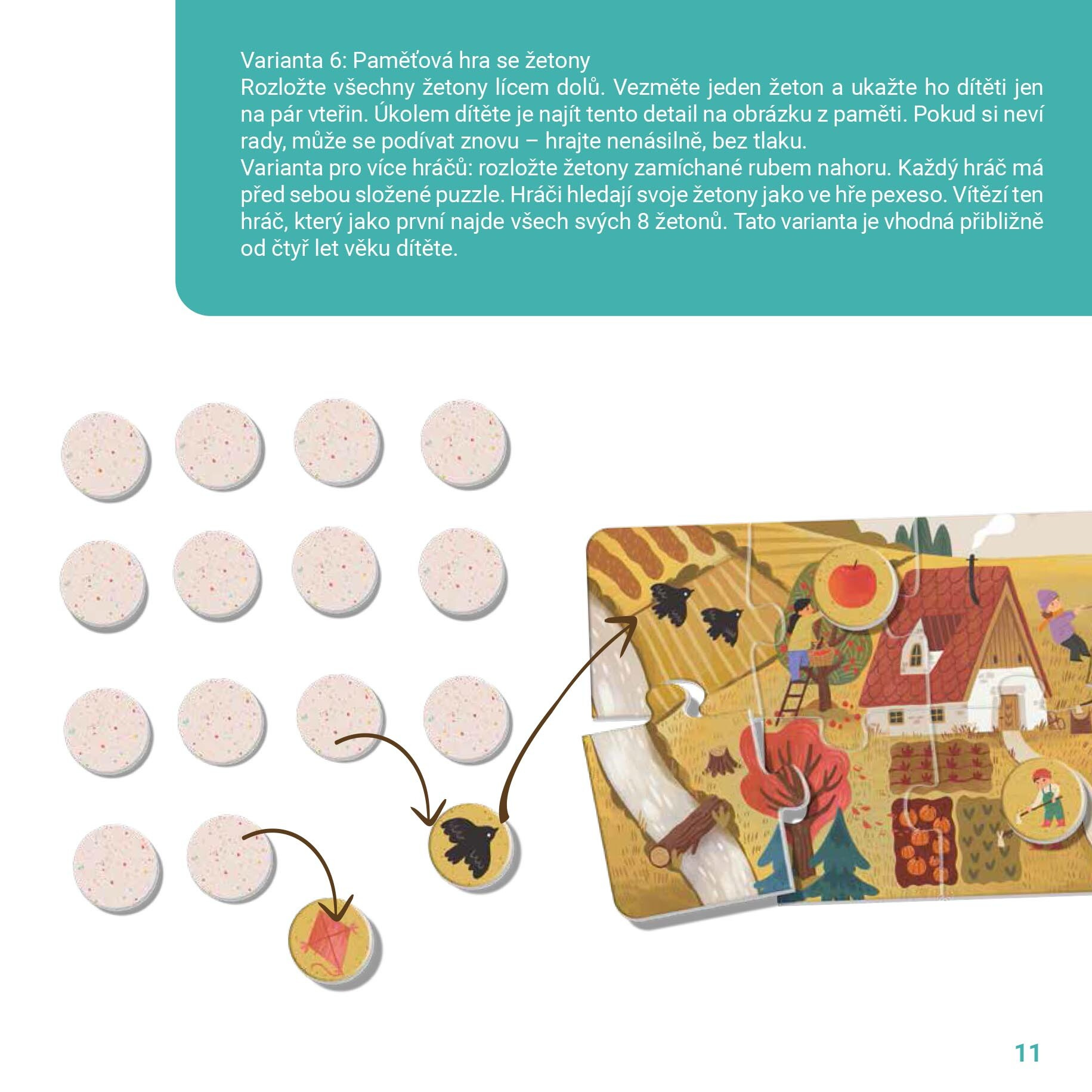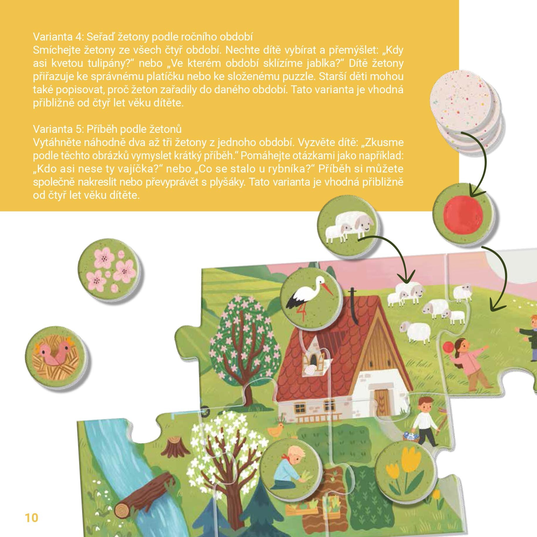 V Radách pre rodičov nájdete 4 herné varianty, ako žetóny aj puzzle využiť (triedenie podľa obdobia, hľadanie detailov, rozprávanie príbehov ai).