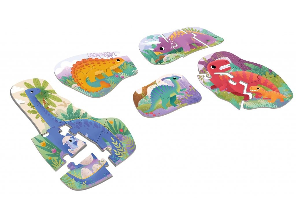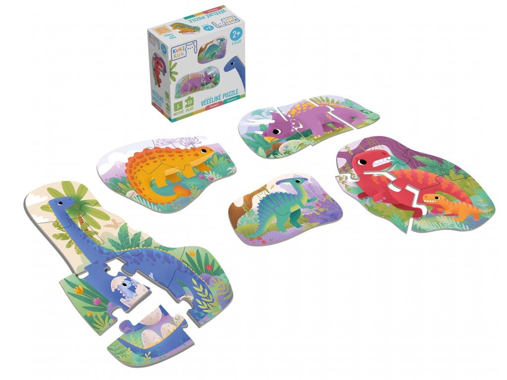 Puzzle s motívom dinosaurov sú ideálnym spôsobom, ako rozvíjať jemnú motoriku a obrazotvornosť u detí už od útleho veku. Zostavenie týchto puzzle poskytuje deťom možnosť postupne zvyšovať úroveň zložitosti a koordinácie, začínajúcu od jednoduchých dvojdielnych obrázkov až po sedemdielne skladačky. Set obsahuje päť roztomilých dinosaurov s ich mláďatami rozdelených do celkom 19 dielikov, pričom najväčší dinosaurus presahuje dĺžku 30 cm. Puzzle je vytvorené z 2 mm hrubého pevného kartónu, čo zaručuje dlhodobú výdrž a odolnosť voči opotrebovaniu. Táto skladačka je nielen zábavná, ale aj výuková, a stáva sa tak perfektným doplnkom pre rodinné popoludnie plné učenia a zábavy. Vyrobené v ČR.