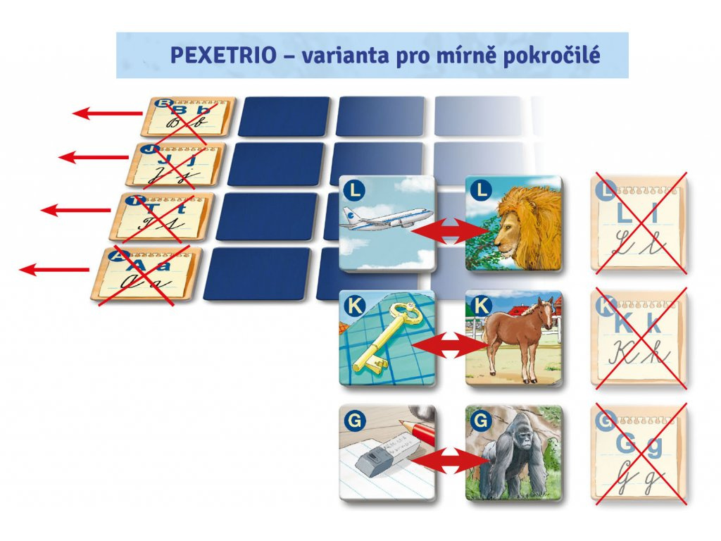 Napríklad v hre Povedz slovo! si hráči precvičujú slovnú zásobu. V hre ABECEDA sa hráči učia radiť písmenká v správnom poradí, aby v budúcnosti mohli znalosť využívať pri orientácii v rôznych zoznamoch a encyklopédiách. Hru Šibenicu asi nie je treba predstavovať. Ďalej tu nájdete Pexetrio (= pexeso s 3 kartičkami) či hru LOTO-TRIO a ďalšie varianty doskovky značky Pexetrio.