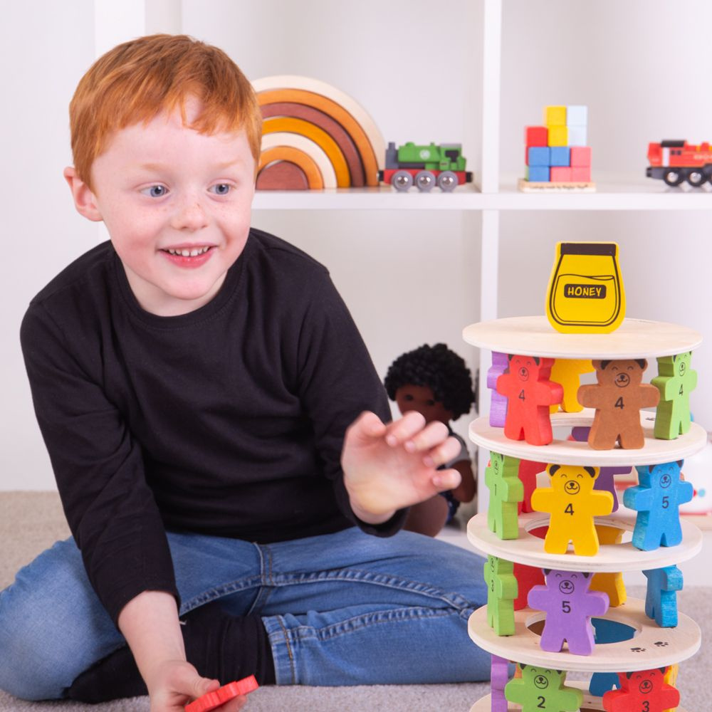 Kdo shodí sklenici medu jako první? Postavte za pomoci medvídků věž. Hoďte si kostkou, která určí barvu medvěda, na první dřevěný kruh postavte 6 medvědů a poté na ně položte další dřevěný kruh. Tento postup opakujte. Ale pozor, ať vám medvědí věž nespadne! Vyrobeno z kvalitních materiálů ze zodpovědných zdrojů. Splňuje evropské bezpečnostní standardy. Vhodné od 3 let.