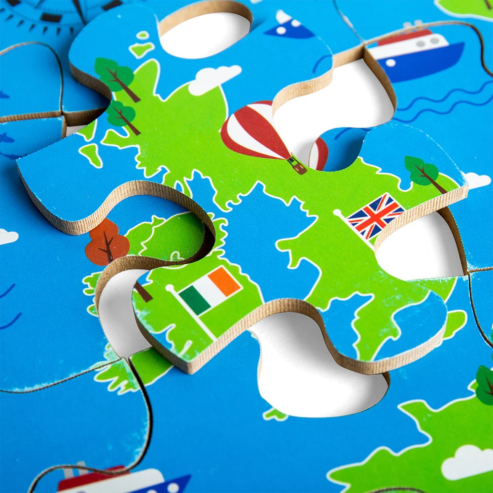 Představujeme vám podlahové puzzle s tématikou Evropských zemí a jejich slavných památek. Děti se zábavnou formou učí, jak vypadá vlajka daného státu a její pomocí spojují jednotlivé státy tak, jak se v Evropě nachází, ale také jejich národní památky. Stavět ho mohou děti od dvou let a zpočátku si procvičí schopnost soustředění, jemnou motoriku, obratnost a sociální dovednost, když vypráví, co která ilustrace představuje. Jednotlivé kusy puzzlíků díky svým rozměrům dobře padnou do dětské ruky a snadno se tak skládají dohromady. Postupně si rozvíjí zeměpisné znalosti. Vyrobeno z vysoce kvalitních a zodpovědně získaných materiálů, odpovídající současným evropským bezpečnostním normám.
