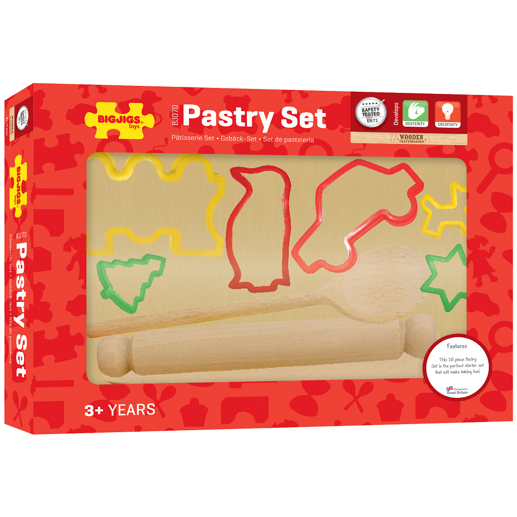 Ideálna sada pre zábavu pri pečení! Obsahuje varešku, stierku, doštičku a valček. Dodávané so šiestimi pestrofarebnými vykrajovačkami na pečivo, vrátane hviezdy, auta, psa, vianočného stromčeka, vláčika a tučniaka. Spĺňa aktuálne európske bezpečnostné normy. Skladá sa z 10 dielov.