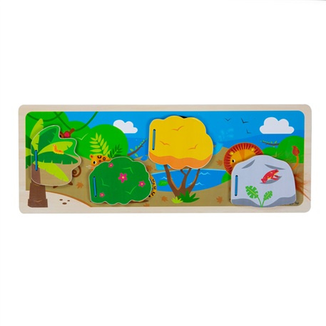 Povzbuďte ty nejmenší, aby prozkoumávali zrakem a dotekem dřevěné senzorické schéma. Co se děje na scéně? Jaké drzé zvířátko se skrývá v houští? Cítíš jeho srst? Co můžete vidět a čeho se dotknout na obloze? Povzbuďte děti, aby diskutovaly o scéně a o tom, co vidí. Rozvíjí slovní zásobu a podporuje vyprávění. Skvělé pro smyslový rozvoj a rozvoj koordinace ruka/oko, jemné motoriky a obratnosti. Vyrobeno z vysoce kvalitních, zodpovědně získaných materiálů. Splňuje aktuální evropské bezpečnostní normy.