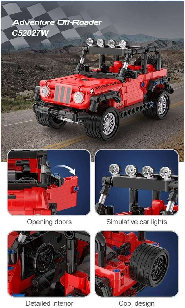Stavebnica CaDA Adventure Off-Roader umožňuje postaviť červené terénne vozidlo v mierke 1:18. Súprava obsahuje 317 dielikov a je určená pre milovníkov stavebníc, ktorí chcú tvoriť a rozvíjať svoju fantáziu. Model má pružinový pohon (pull-back), ktorý mu umožňuje pohyb až do vzdialenosti 20 metrov. Vďaka štyrom gumovým kolesám je ideálny na rôzne povrchy.