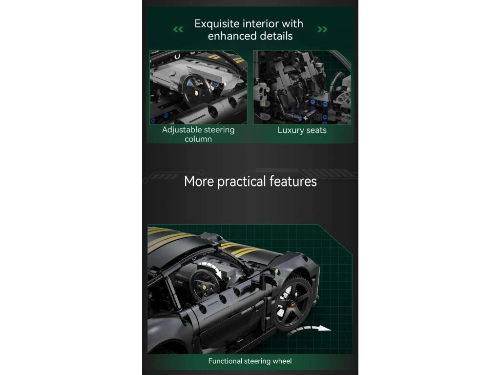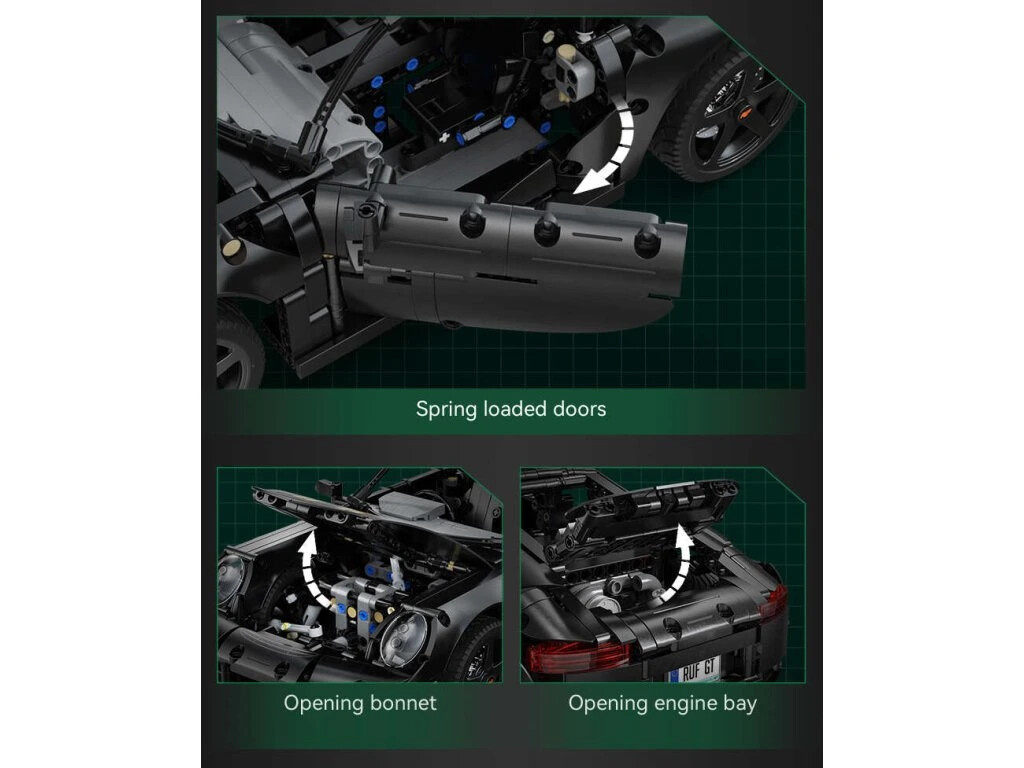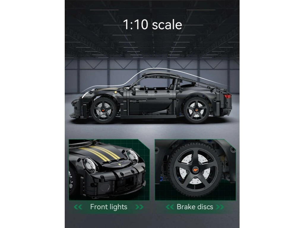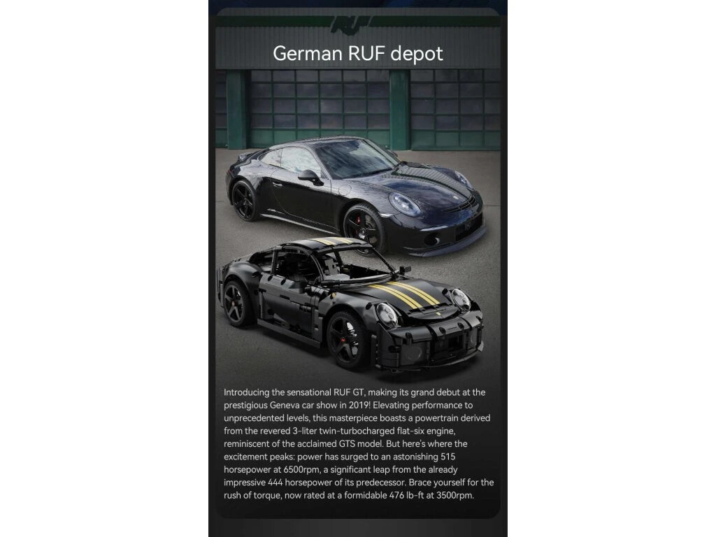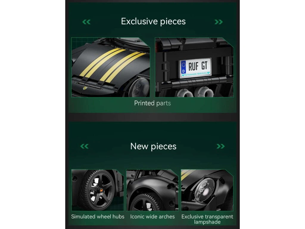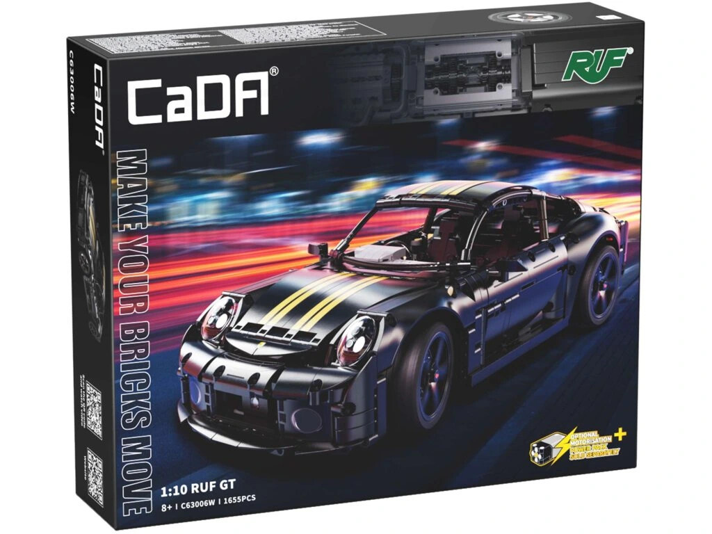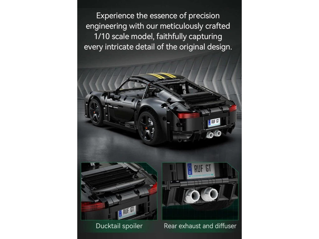 Stavebnica športového auta RUF GT v čiernej farbe obsahuje 1655 dielikov a umožňuje postaviť auto v mierke 1:10. Športové auto je určené pre deti od 8 rokov.