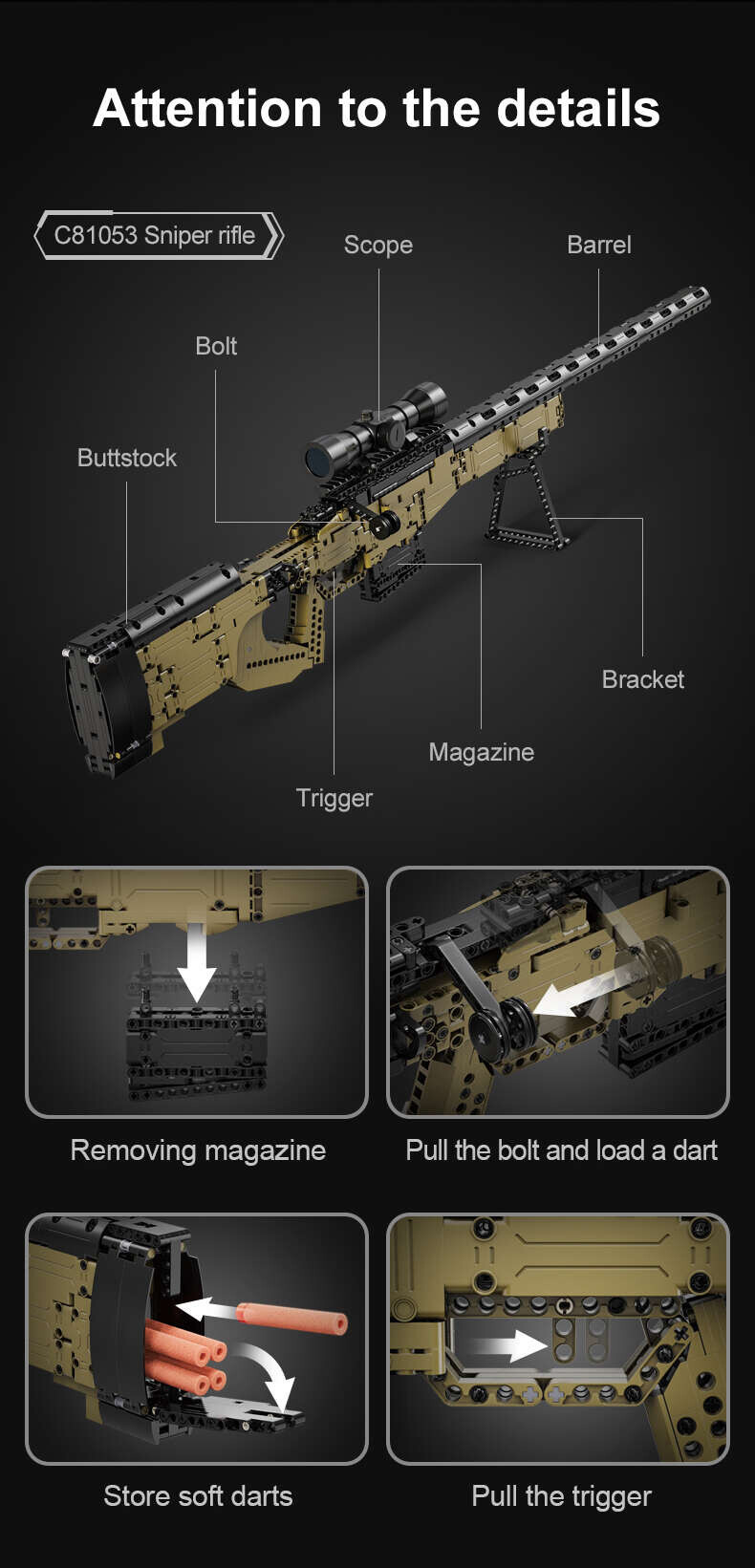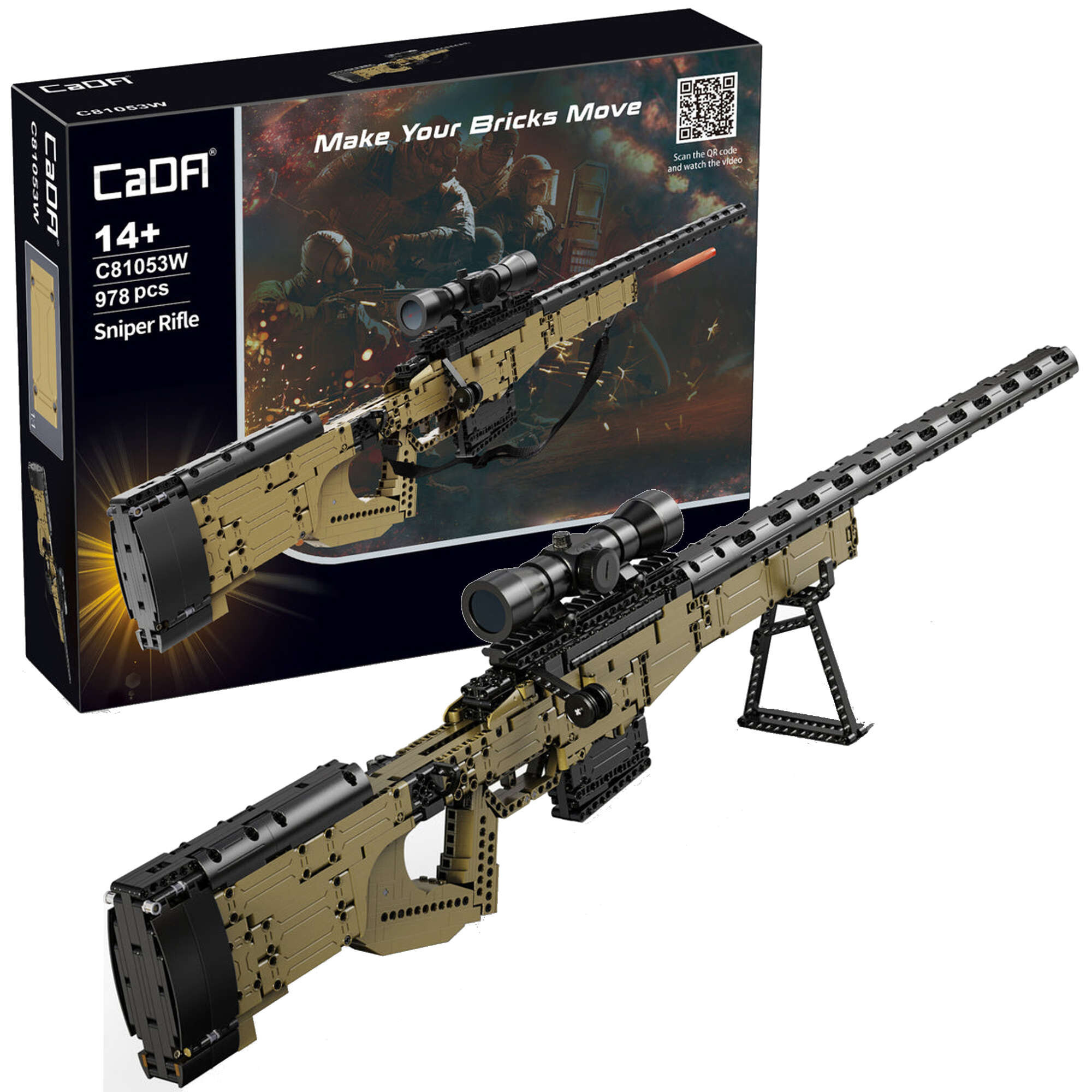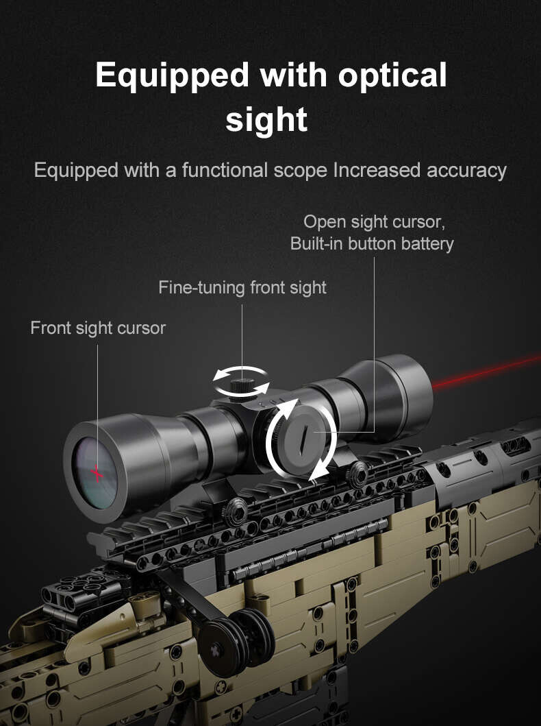 Stavebnica odstreľovacej pušky AWM s optickým zameriavačom je kvalitne spracovaná a jej konštrukcia zodpovedá skutočnému modelu. Stavebnica umožňuje zostaviť si vlastnú pušku AWM vrátane funkčného ostreľovačského ďalekohľadu. Zostavená zbraň, ktorá meria 113 cm na dĺžku a 25 cm na výšku, má pohyblivé časti, ako je spúšť, zásuvka nabíjacej páky, vyberateľný zásobník, zameriavací ďalekohľad a tiež popruh na prenášanie. Zbraň dokáže vystreliť projektil vyrobený z mäkkého plastu. Súprava obsahuje 978 stavebných blokov a 5 projektilov a sľubuje veľa zábavy pre stredne pokročilých staviteľov.