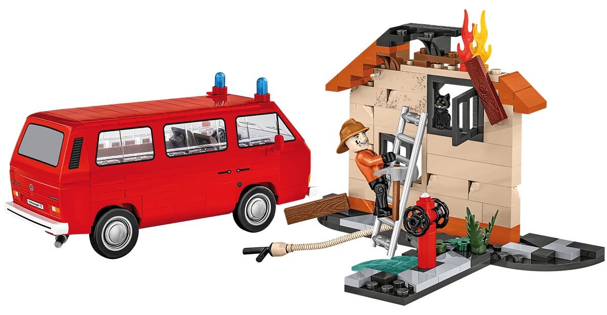 Volkswagen T3 bol predstavený v roku 1979 ako tretia generácia legendárnej rady Transporter a rýchlo sa stal jedným z najspoľahlivejších úžitkových vozidiel svojej doby. V nemeckých hasičských zboroch slúžil najmä ako MTF – vozidlo na prepravu jednotky, mobilné veliteľské stanovište alebo ako KLAF, určený na menšie technické zásahy a každodenné intervencie. Vďaka jednoduchej konštrukcii, nízkym prevádzkovým nákladom a vysokej odolnosti sa T3 stal jedným z najčastejšie používaných hasičských vozidiel svojej éry. Stavebnica COBI zachytáva túto legendu záchranárskej techniky a ponúka spojenie hry, histórie a zberateľskej hodnoty v jednom kompaktnom modeli.