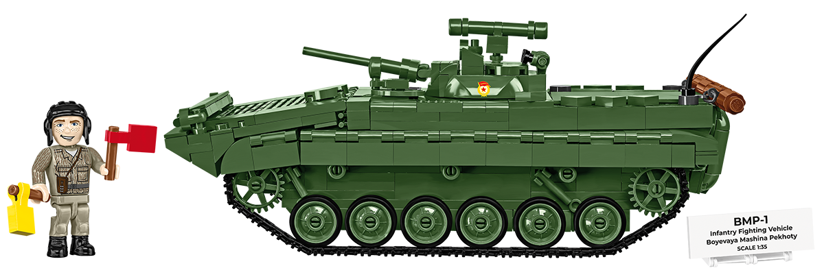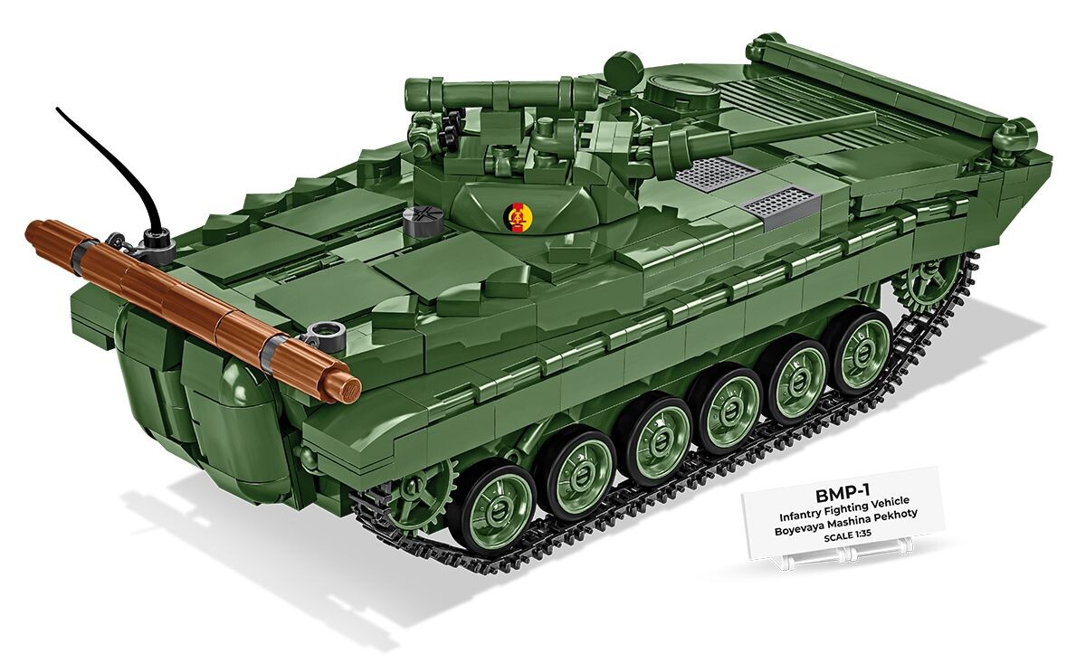 BMP-1 je ikonické sovietske bojové vozidlo pechoty zavedené do služby v roku 1966 ako prvá sériovo vyrábaná konštrukcia tohto typu. Spájalo vysokú mobilitu, schopnosť prepravy výsadku a silnejšiu výzbroj v podobe kanónu a protitankových riadených striel. Vozidlo sa rozšírilo do armád väčšiny krajín Varšavskej zmluvy, vyrábalo sa aj v Československu a bolo nasadené v mnohých konfliktoch – od Blízkeho východu až po Afganistan. Stavebnica COBI verne zachytáva charakteristické rysy tohto historicky významného stroja a ponúka atraktívny zážitok pre všetkých nadšencov vojenskej techniky aj zberateľov.