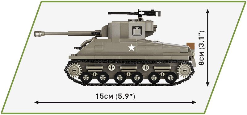 Postavte si model amerického tanku Sherman M4A3E8 v mierke 1:48 v olivovej farbe. Model má mnoho pohyblivých častí, napríklad námer kanónu, otočnú vežu a funkčný pásový podvozok. Zostavený model sa skladá z 320 dielikov a meria 15 cm na dĺžku a 6,5 cm na šírku a 8 cm na výšku. Kocky COBI sú plne kompatibilné so stavebnicami LEGO.