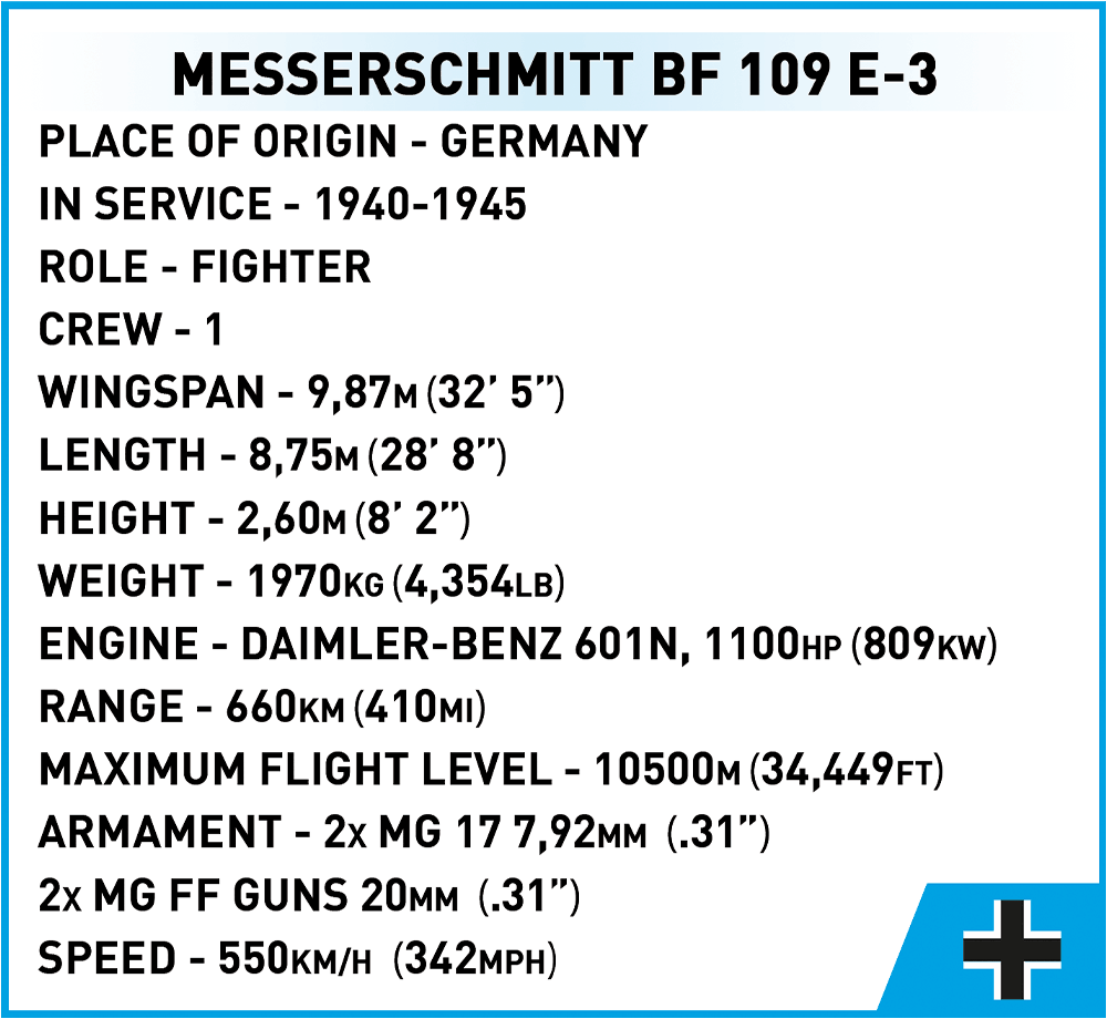 Postavte si stíhacie lietadlo Luftwaffe z druhej svetovej vojny Messerschmitt BF-109 E-3 v mierke 1:32. Lietadlo má pohyblivú vrtuľu a krídelká. Jeho rotačné gumové kolesá sa vysúvajú z podvozku vo vzletovej alebo pristávacej polohe. Kabínu pilota je možné otvoriť a posadiť figúrku na ovládanie, ktoré má tiež potlač na zadnej strane! Zostavený model meria 27 cm na dĺžku, 13 cm na výšku a rozpätie krídiel má 30,5 cm. Stavebnica sa skladá z 333 dielikov a obsahuje jednu figúrku. Súčasťou sady je aj špeciálny stojan, ktorý zatraktívni vystavenie modelu, a štítok s názvom lietadla. Kocky COBI sú plne kompatibilné so stavebnicami LEGO.