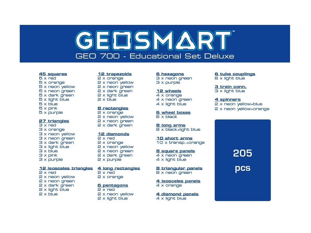 Vďaka svojmu obsahu a úložnému boxu je tento set veľmi vhodný nielen ako domáca zábava pre deti, ale tiež ako stavebnica pre väčšie detské skupiny v materských školách a školách. Vďaka pestrým farbám, rôznym tvarom, silným magnetom a patentovanému dvojitému bezpečnostnému systému uzamknutia magnetu ponúka GeoSmart neprekonateľnú bezpečnosť a dlhú životnosť pre detskú tvorivú hru. Všetky súpravy stavebnice GeoSmart sú kompatibilné. Deti tak môžu vytvárať nekonečné kombinácie a dať tak priechod svojej detskej predstavivosti. Stavebnica je vhodná pre deti od 3 rokov. Hra s touto stavebnicou je pre deti veľmi prínosná. Pomáha rozvíjať priestorovú predstavivosť, koordináciu ruky a oka, koncentráciu, logické myslenie a kreativitu. V sete je 132 základných magnetických dielikov rôznych tvarov a 73 ďalších tvorivých komponentov (kolesá, spinnery, ťahadlá a ďalšie). Podrobný opis zloženia je uvedený na fotografii.