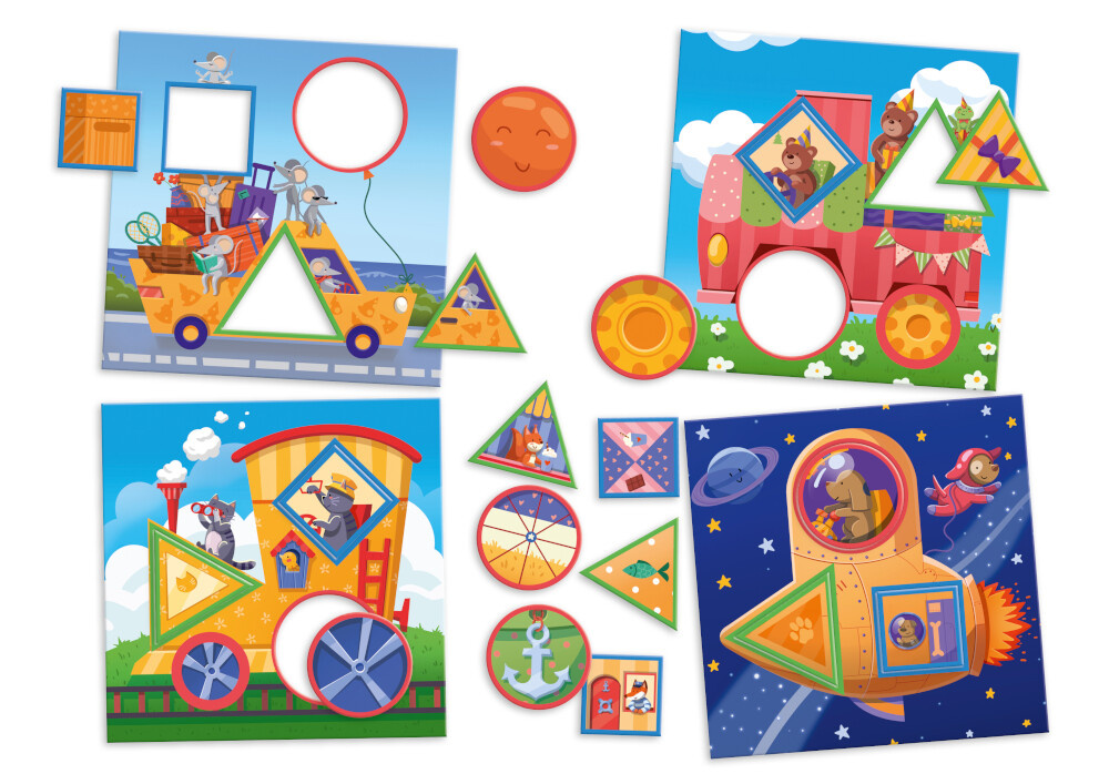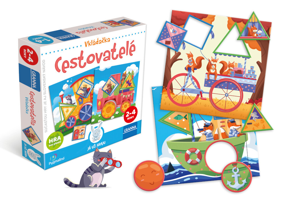 Hra Cestovatelia je originálna vkladačka pre deti od 2 do 4 rokov. Deti sa pri vkladaní obrázkov naučia spoznávať tvary kruhu, trojuholníka a štvorca, pričom rozvíjajú jemnú motoriku, vyjadrovacie schopnosti a sústredenie. Táto vzdelávacia vkladačka neobsahuje žiadne plasty. Vhodné pre deti od 2 rokov.