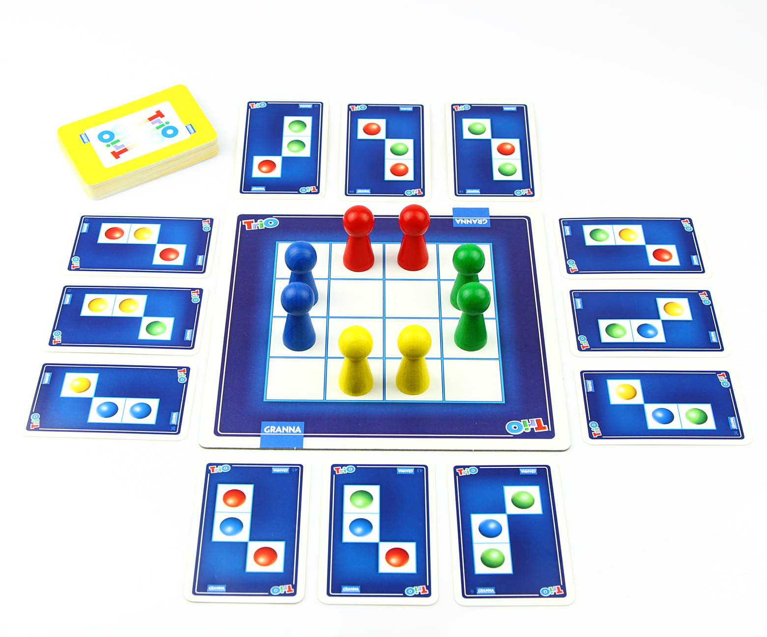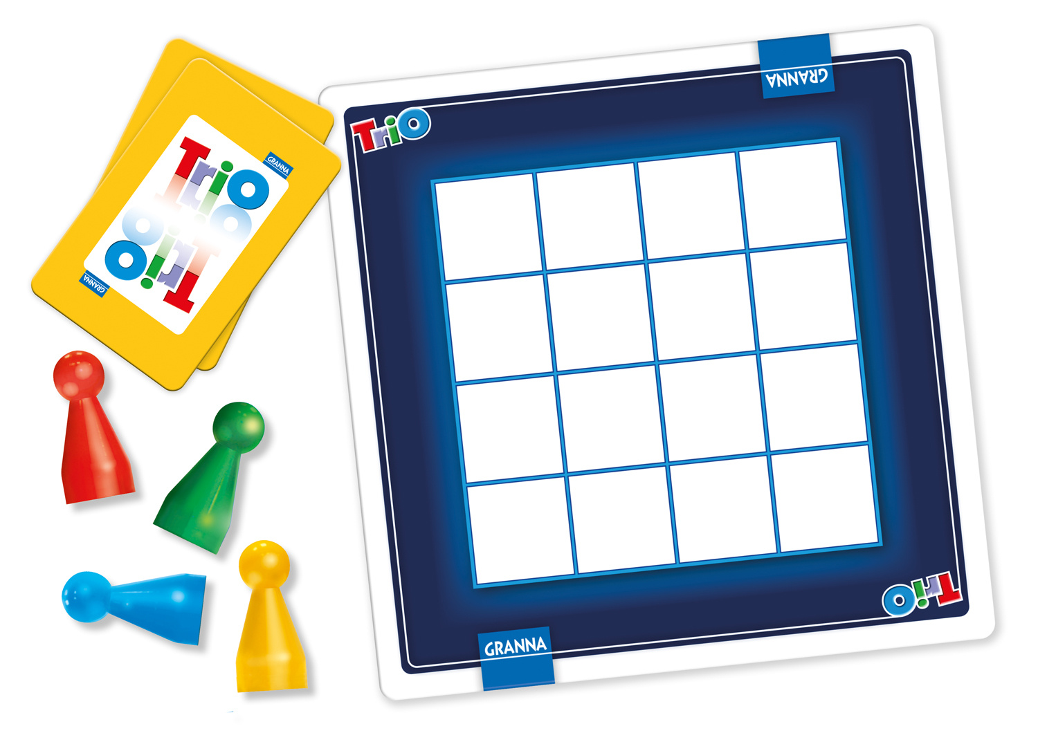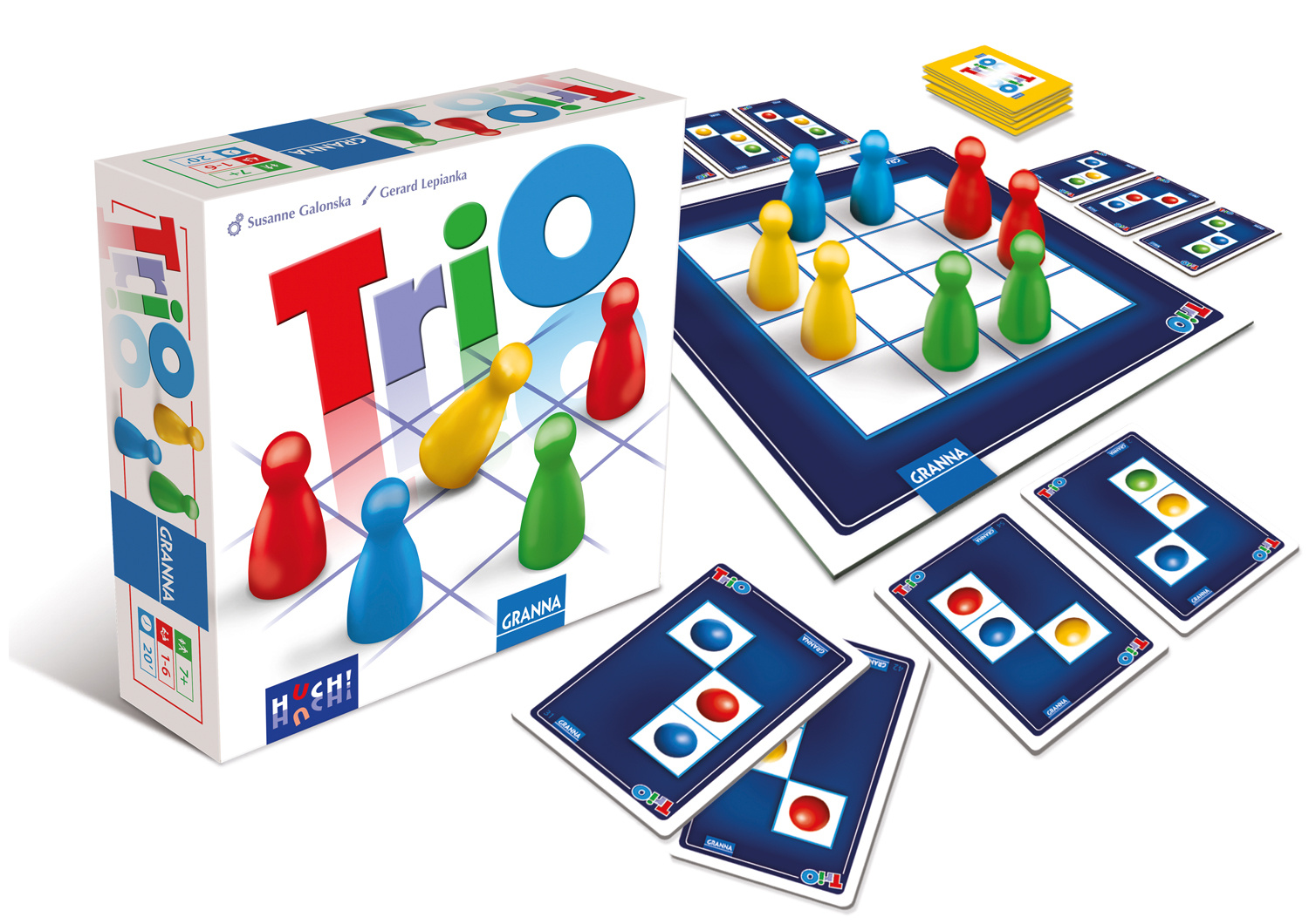 Rýchla postrehová hra pre 1 až 4 hráčov vo veku od 7 rokov vás udrží v neustálom napätí. Postreh, priestorová predstavivosť a rýchla reakcia - to všetko je potrebné k víťazstvu v hre Trio. Pravidlá umožňujúce tri herné varianty sú jednoduché: kam je treba premiestniť jednu z figúrok na hracej ploche, aby vznikla zostava podľa niektorej z vyložených kariet? Už viete? Potom stačí zavolať „Trio!“ a vziať si kartu. Kto zhromaždí najviac kariet, vyhráva!