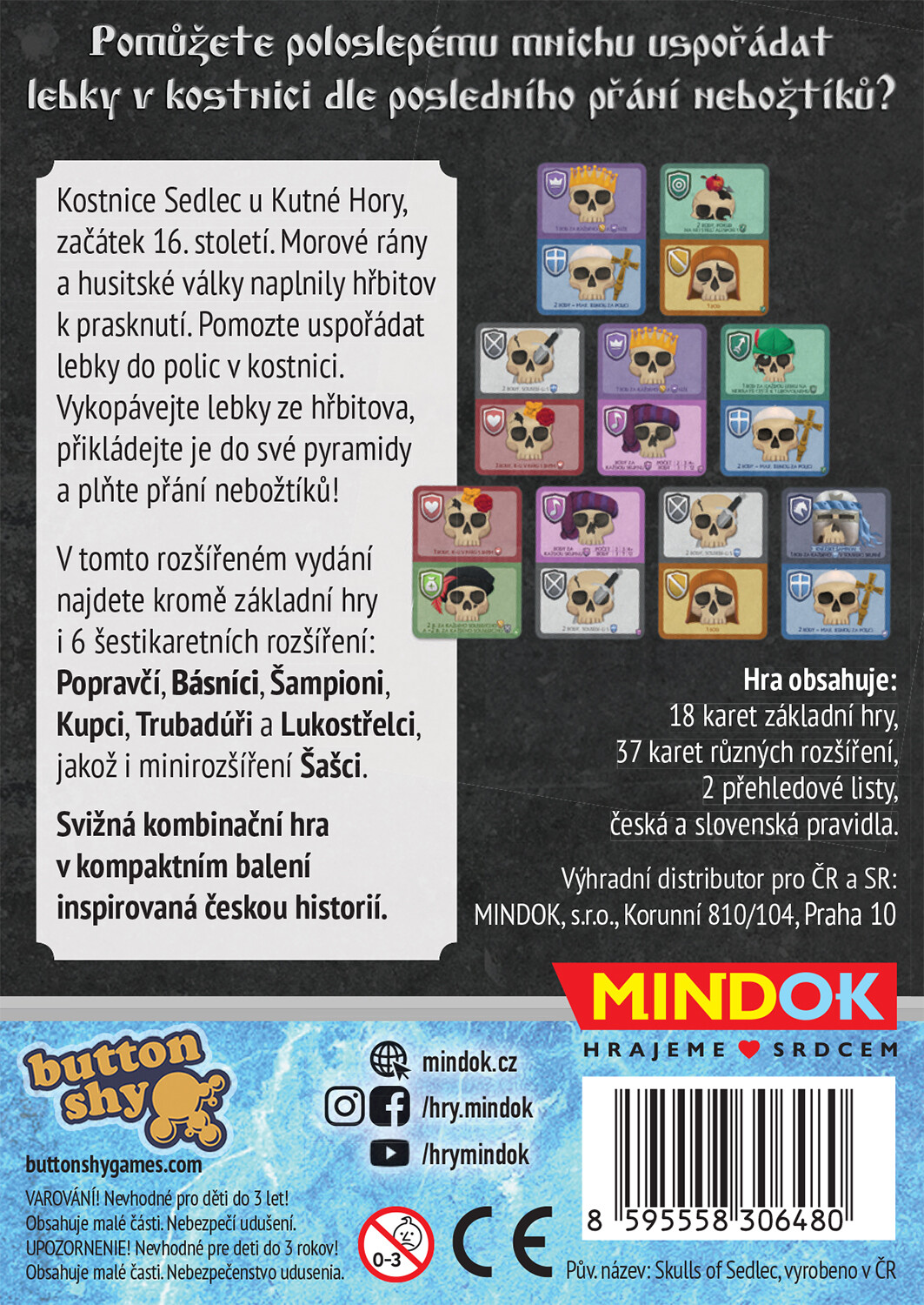 V tejto krabičke nájdete okrem základnej hry aj 6 rôznych rozšírení po 6 kartách a jedno mini rozšírenie, ktoré budete môcť ľubovoľne pridávať do svojich partií. Vďaka tomu bude možné zahrať si Kostnicu aj v 4 a 5 hráčoch!