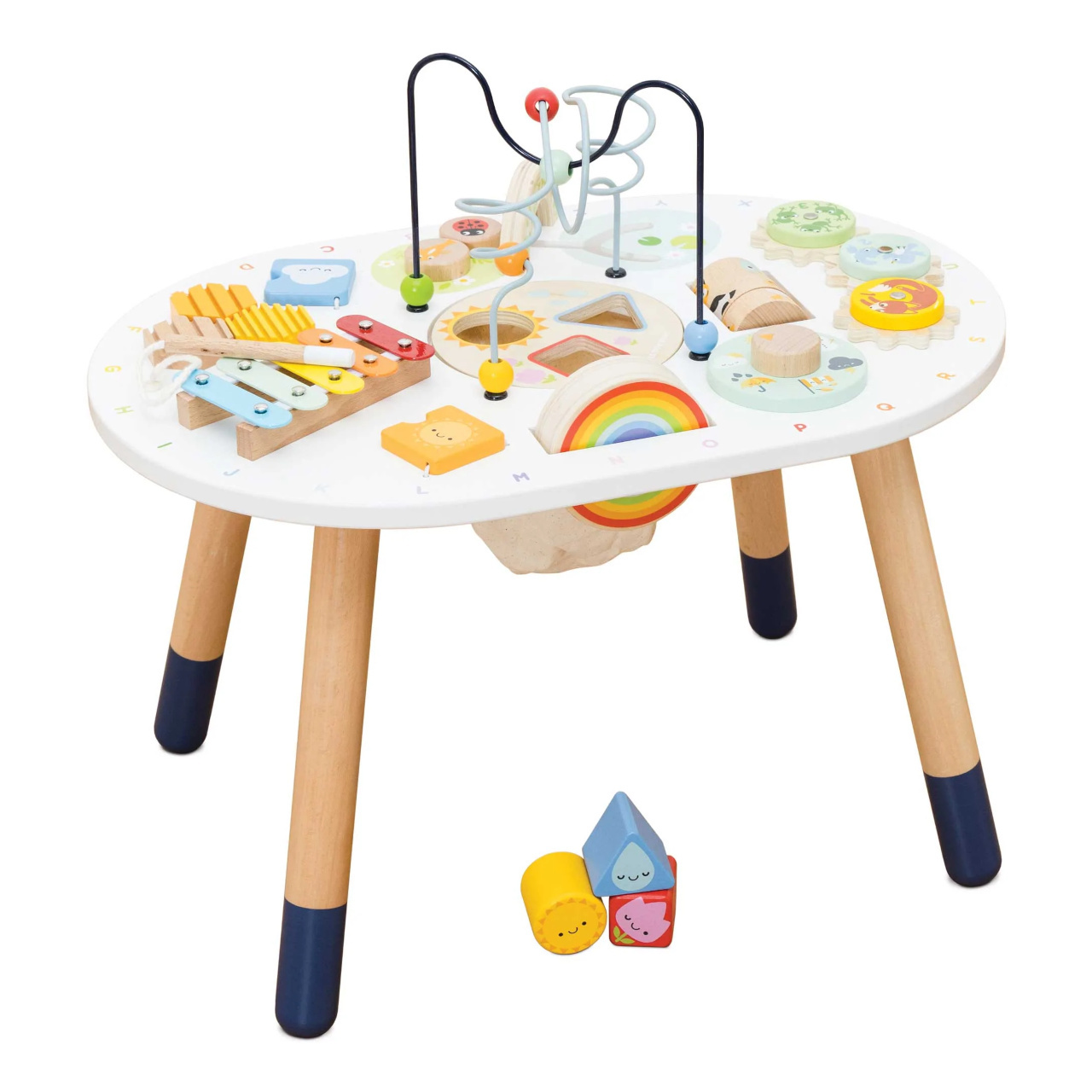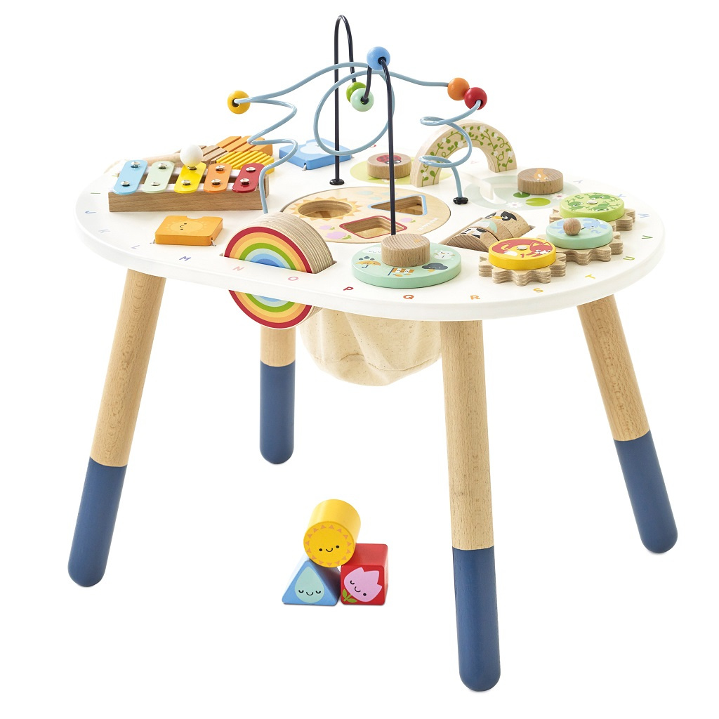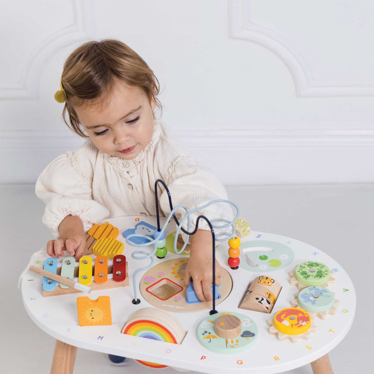 Tento aktivní motorický stůl potěší nejen oko, ale také ostatní smysly. Perfektní hračka pro batolata, pomůže s rozvojem představivosti. Stoleček je plný multisenzorických aktivit, které zabaví všechny zvídavé děti. Najdou na něm korálkový labyrint, vkládačku, xylofon, ozubená kolečka, otočné chrastítko a další! Takový počet aktivit děti zabaví na dlouhé hodiny.