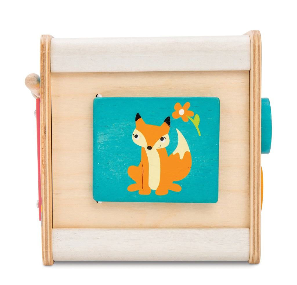 Veselá motorická kostka v kombinaci přírodního dřeva a barevných prvků a ilustrací. Hračka designována zkušenými řemeslníky děti inspiruje k představivé hře, je vyrobena eticky z udržitelného kaučukového dřeva. Mezi prvky motorické hračky patří otočné kolo počasí, mini xylofon, posuvní ptáčci, ozubená kola, otočné oboustranné dílky ABC + 123 a dvířka s liškou. Malováno netoxickými barvami, bezpečnost dětí zaručují zaoblené hrany.