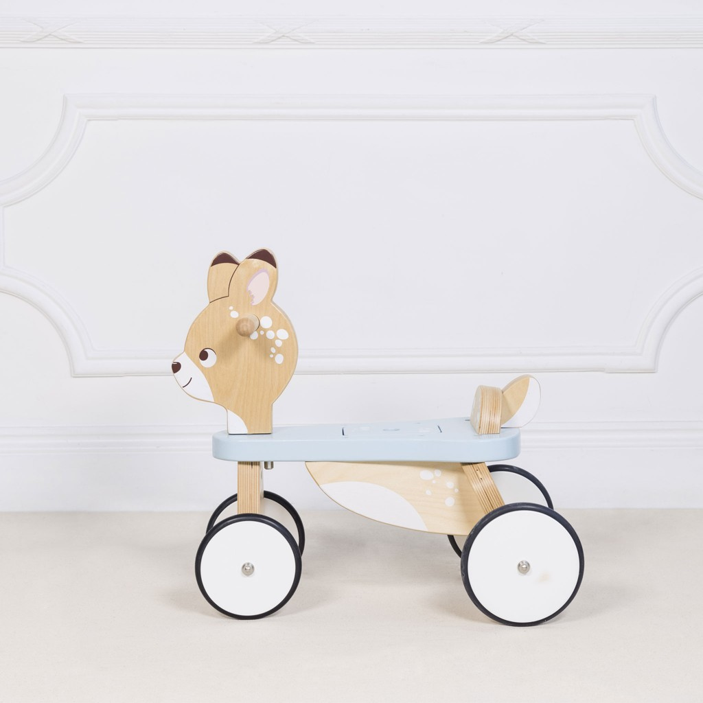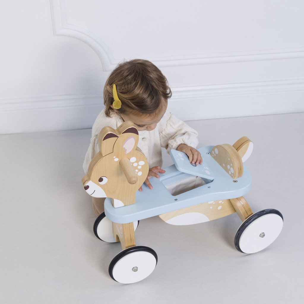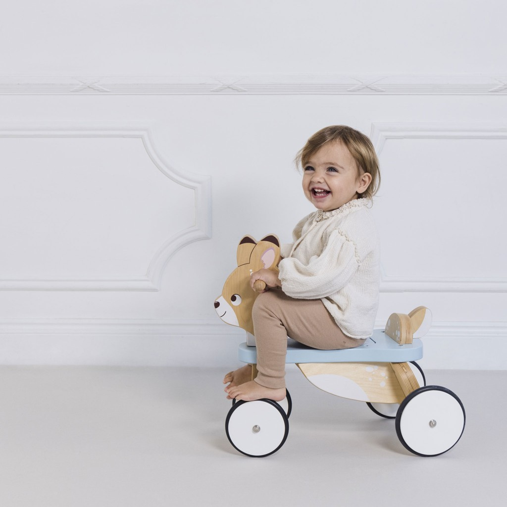 Dřevěné odrážedlo koloušek děti vezme na nezapomenutelnou projížďku plnou zábavy. Poutavý design a pevná konstrukce, nechybí ani skrytý úložný prostor na sedadle. Děti si v něm mohou ukrýt své poklady nebo svačinku. Malováno pastelovými barvami, vyrobeno z udržitelného kaučukového dřeva. Díky odrážedlu budou mít děti každodenní pohyb a budou silnější, procvičí si koordinaci a rovnováhu.